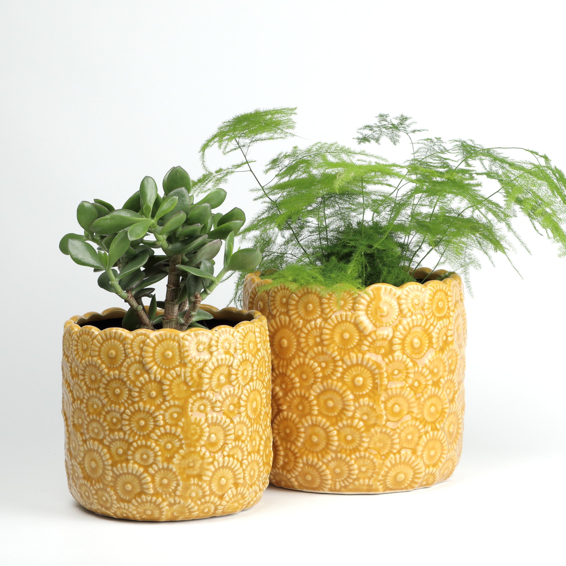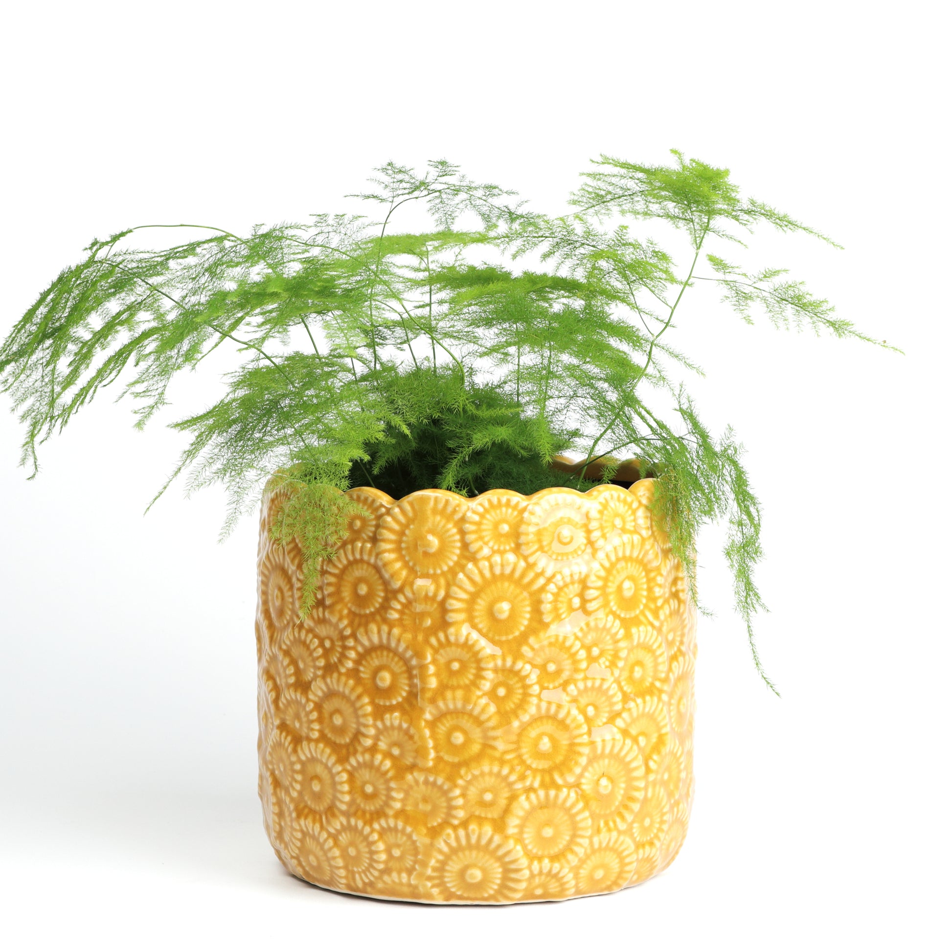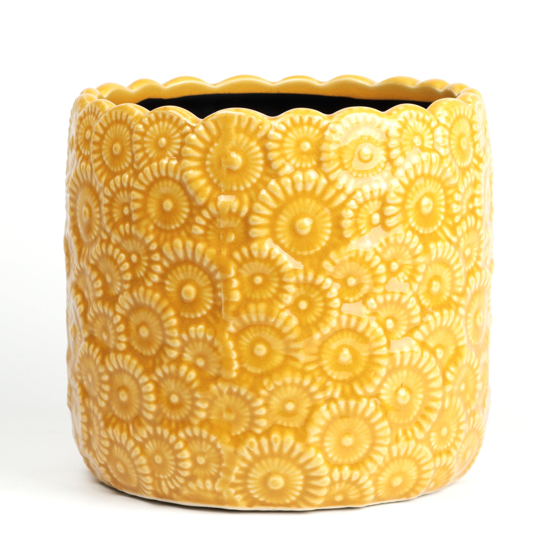 Add a burst of sunshine to your space with this textured, floral-inspired ceramic pot. Its intricate, raised flower pattern in a warm golden yellow glaze offers a playful, vintage vibe, while the scalloped rim adds a charming touch. Sealed, no drainage holes. Available in two sizes.
