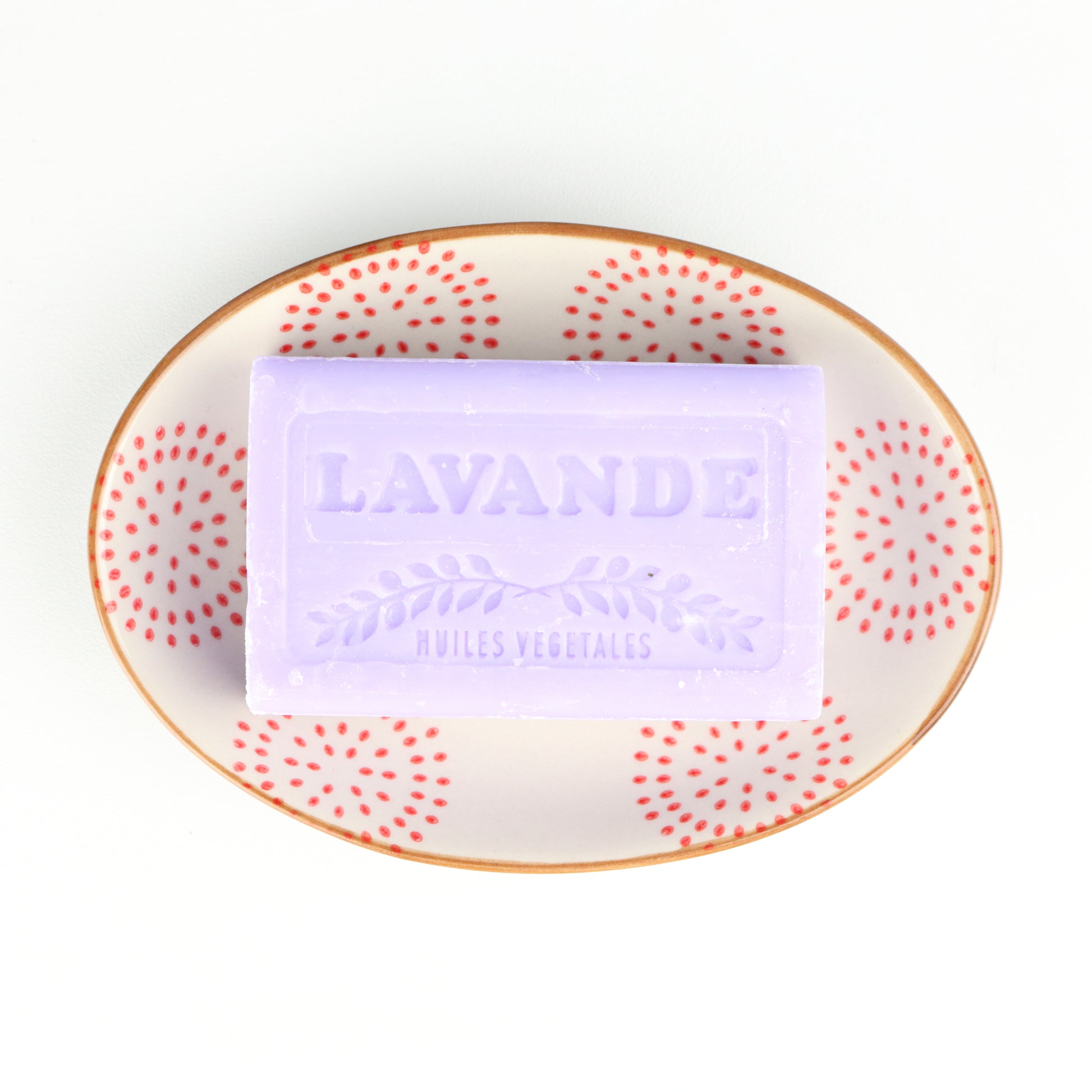 An oval shaped soap dish with an amber rim and concentric circles of auburn dots around centred drainage holes. Handmade, each piece is unique.
