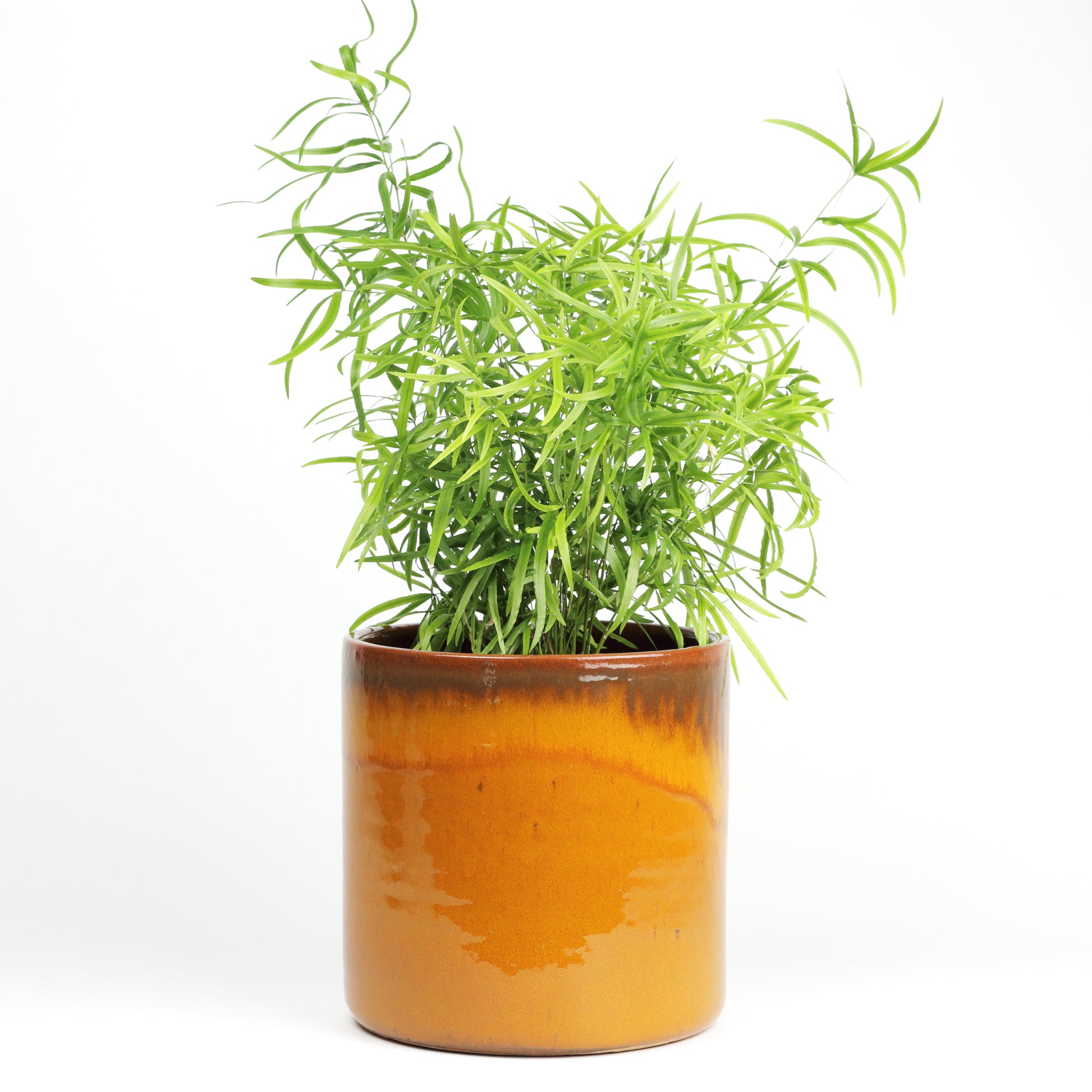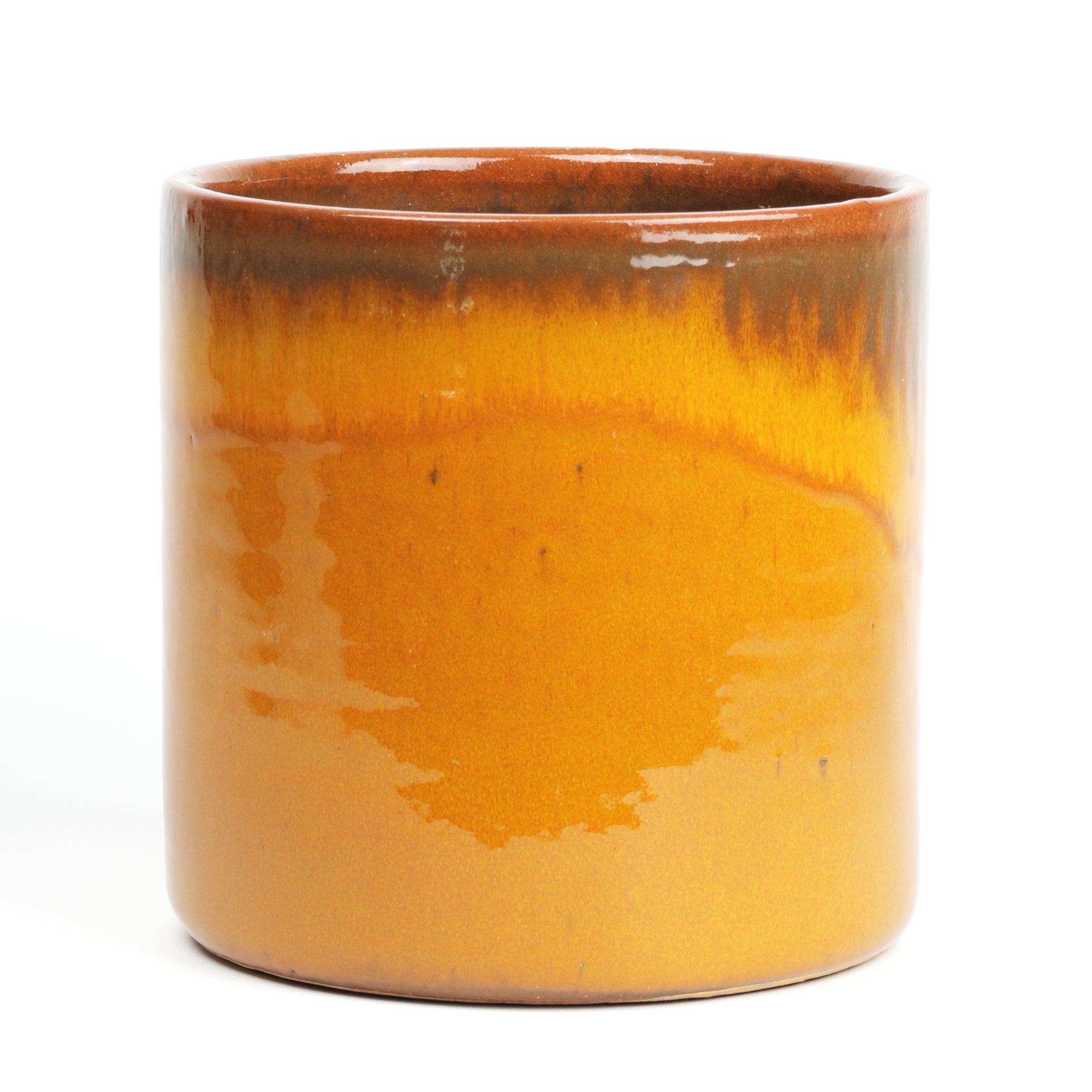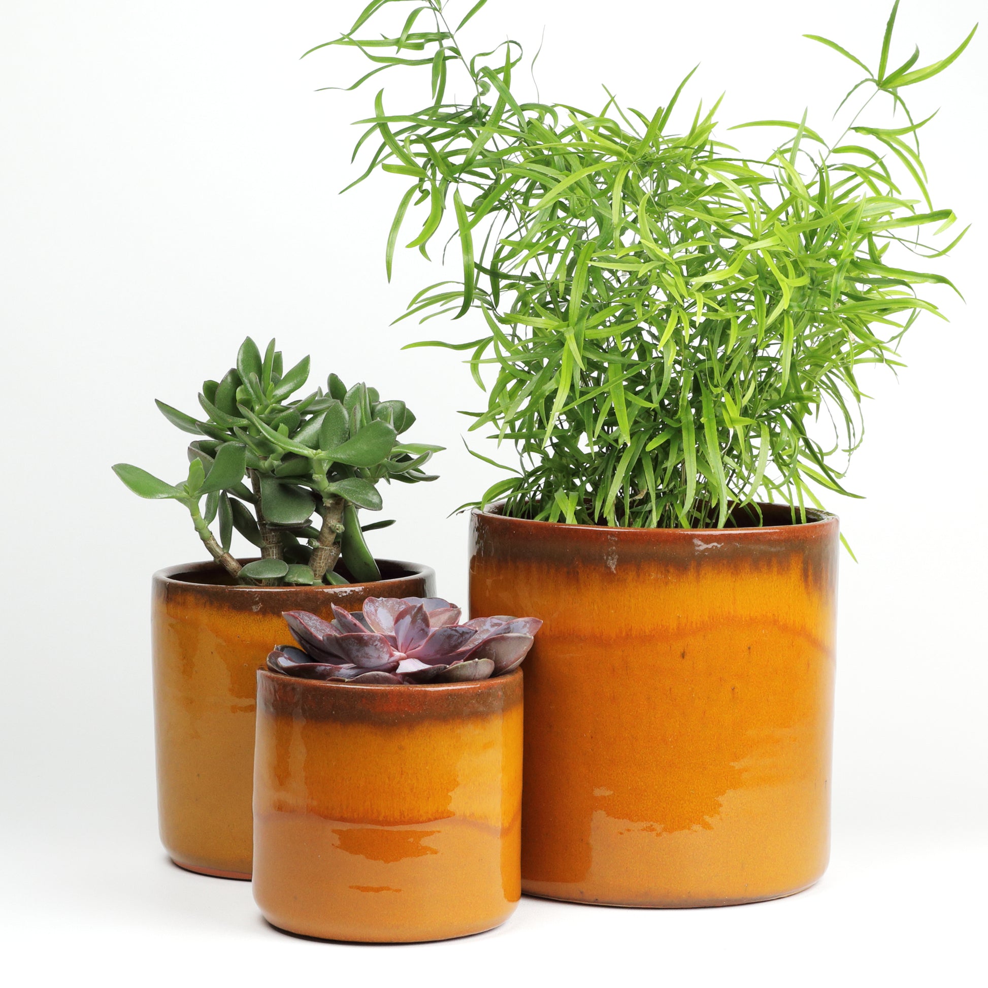 A beautiful sunset inspired plant pot, the perfect colour pop for any interior. Hand thrown in a cylindrical shape, with thick walls, these sturdy pieces will stand the test of time. Glazed in a vibrant amber base, with a brown rim, the contrast is beautifully playful. Handmade in Portugal. Sealed, no drainage holes. Available in three sizes.