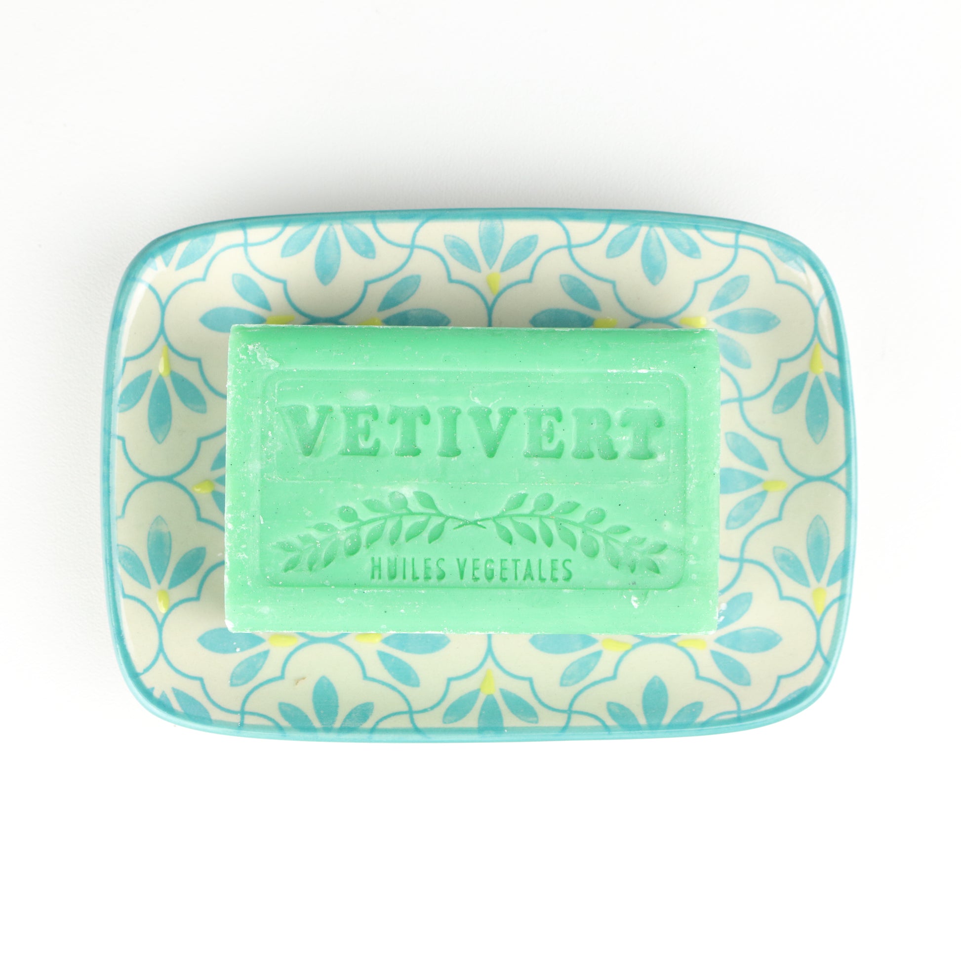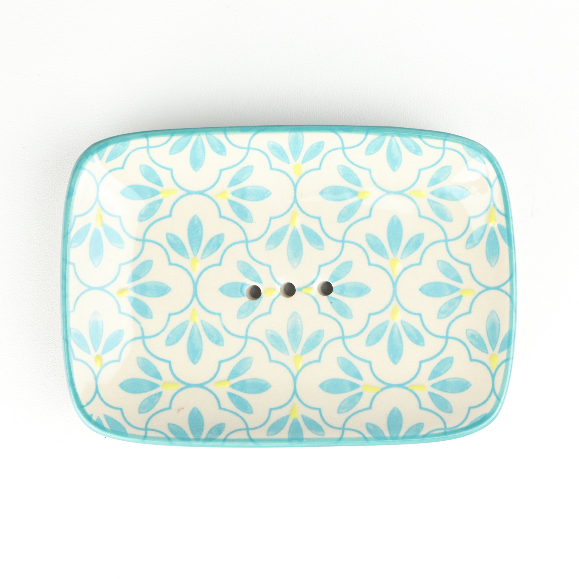 A rectangular soap dish with curved edges and a soft sky blue rim. The body of the dish is decorated with azure fans around centred drainage holes. Handmade, each piece is unique.