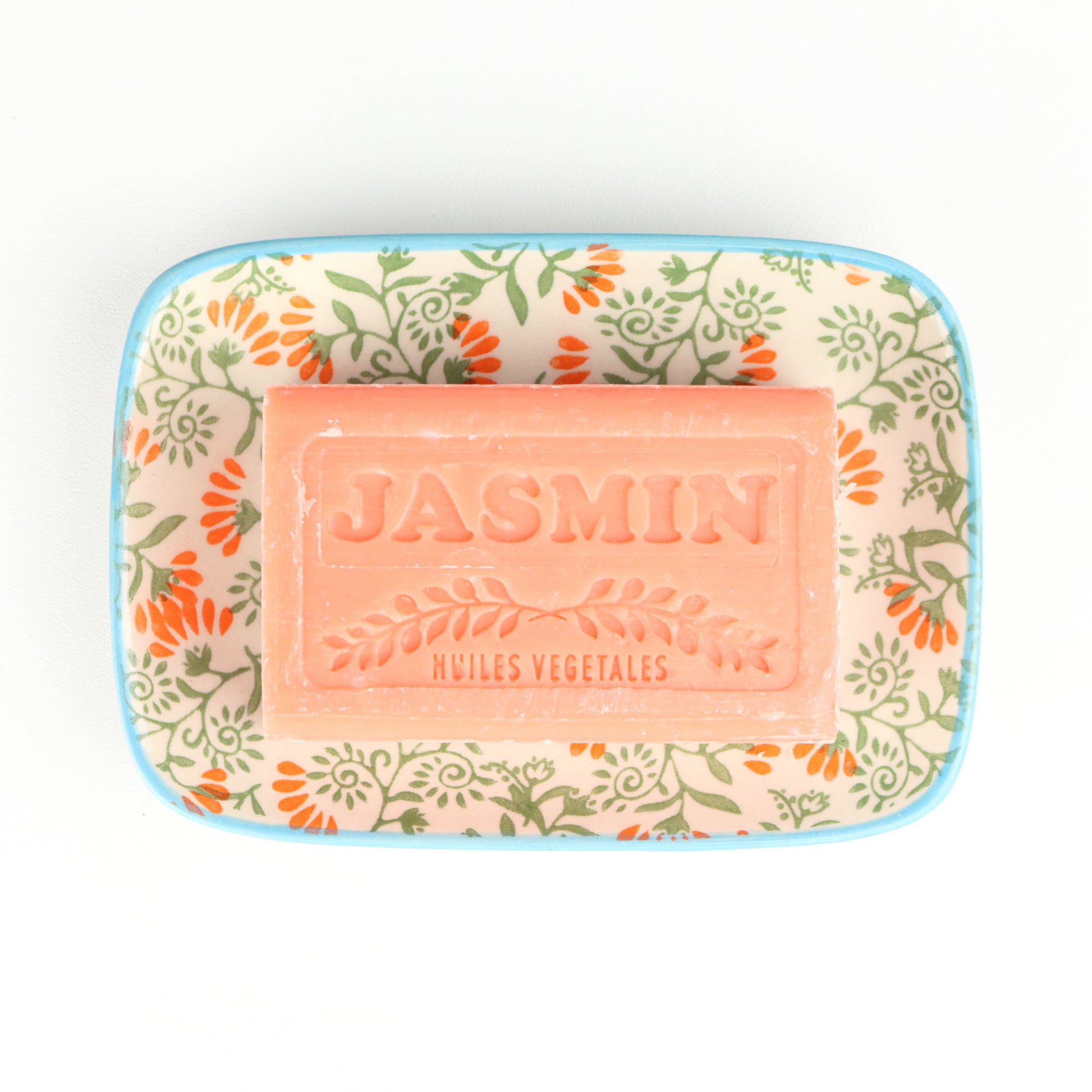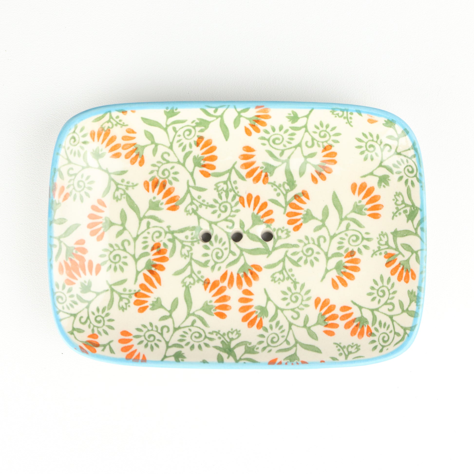 A rectangular soap dish with curved edges and a soft aqua rim. The body of the dish is decorated with orange petalled ferns around centred drainage holes. Handmade, each piece is unique.