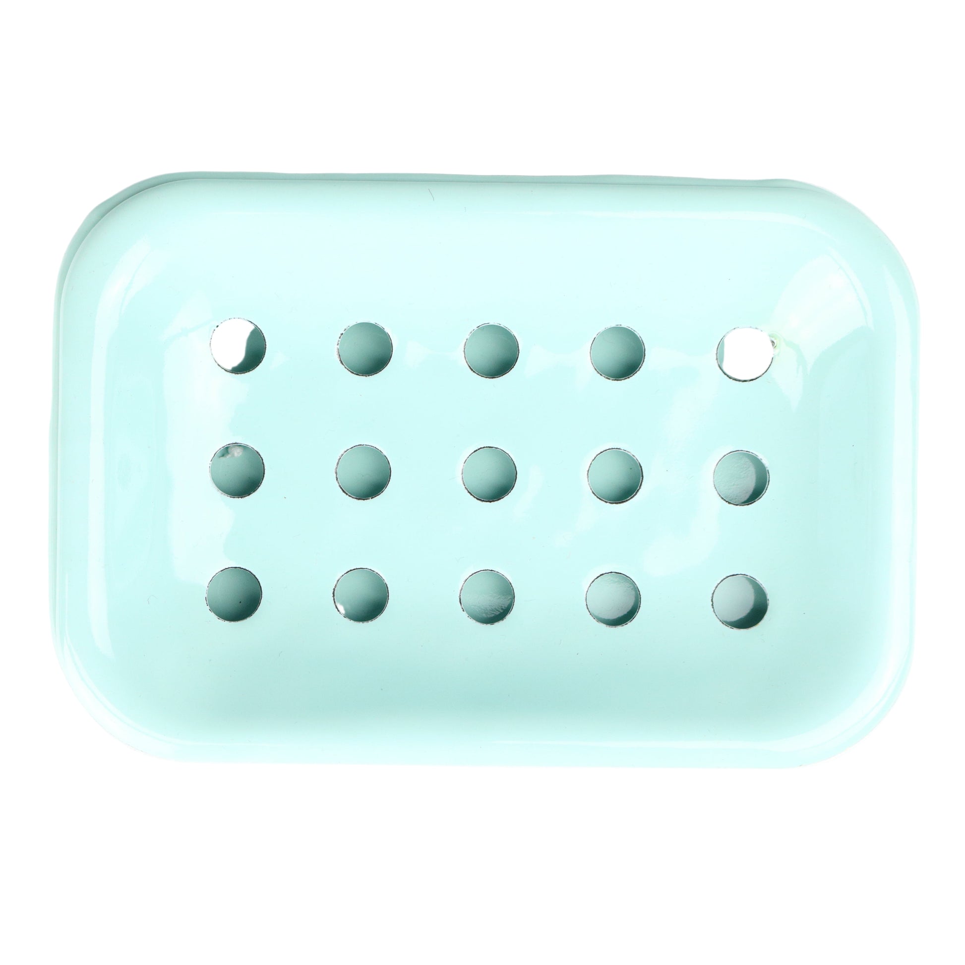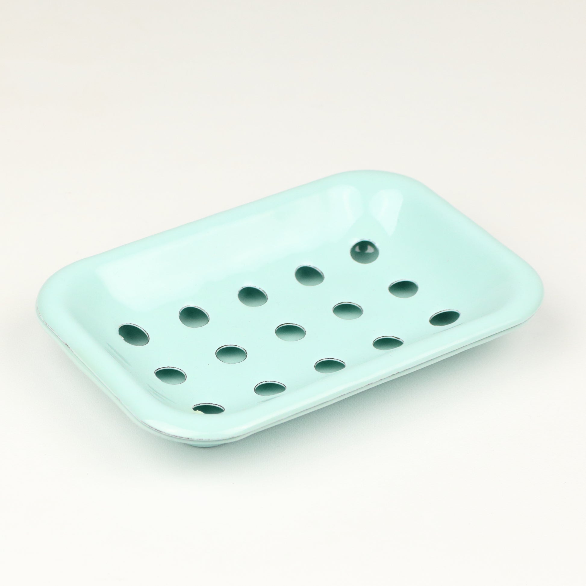 A rectangular soap dish in a soft baby blue and made from high quality steel. The dish itself comes in two parts; a dish with drainage holes to keep your soap from melting and a dish that goes below to catch the drainage. Handmade, each piece is unique.