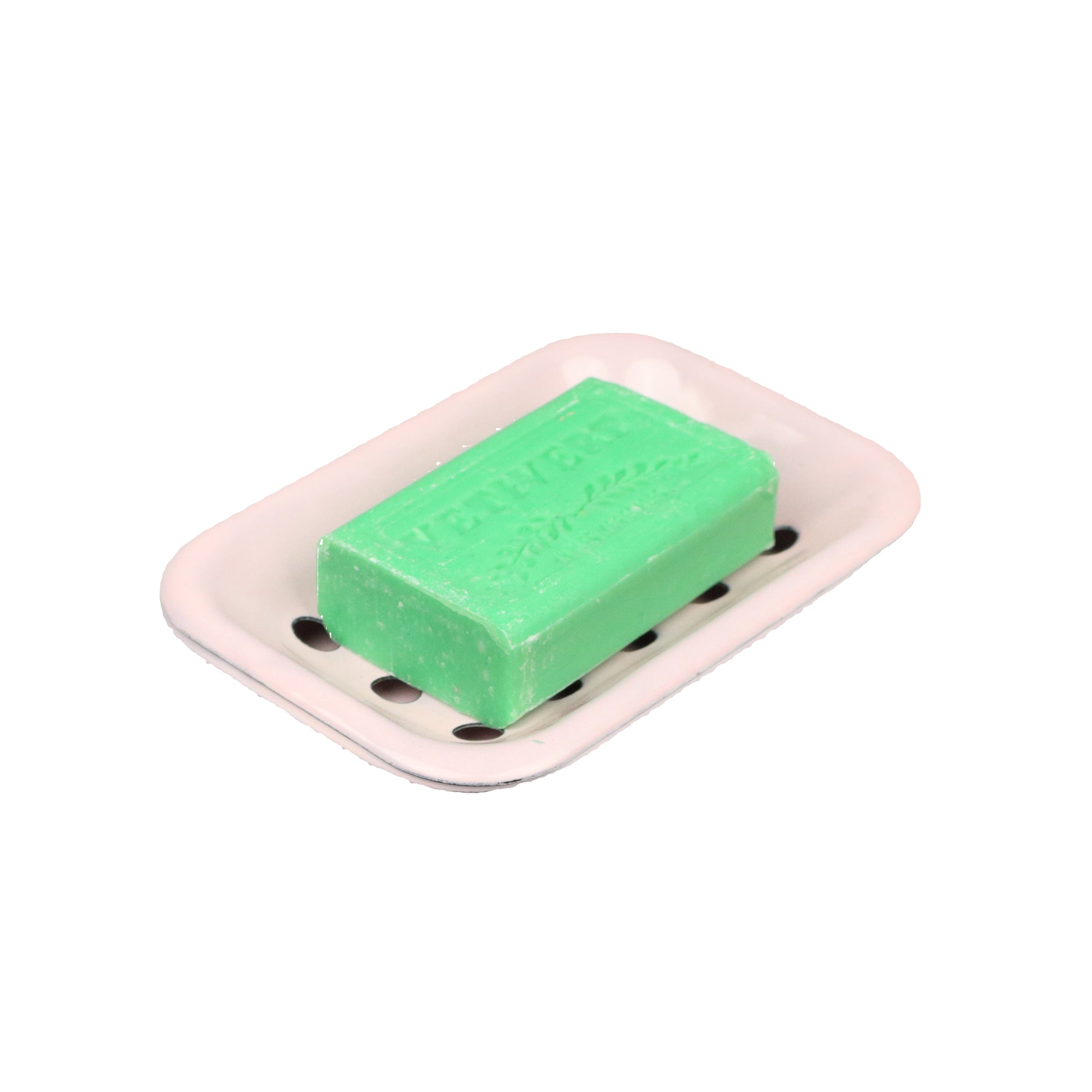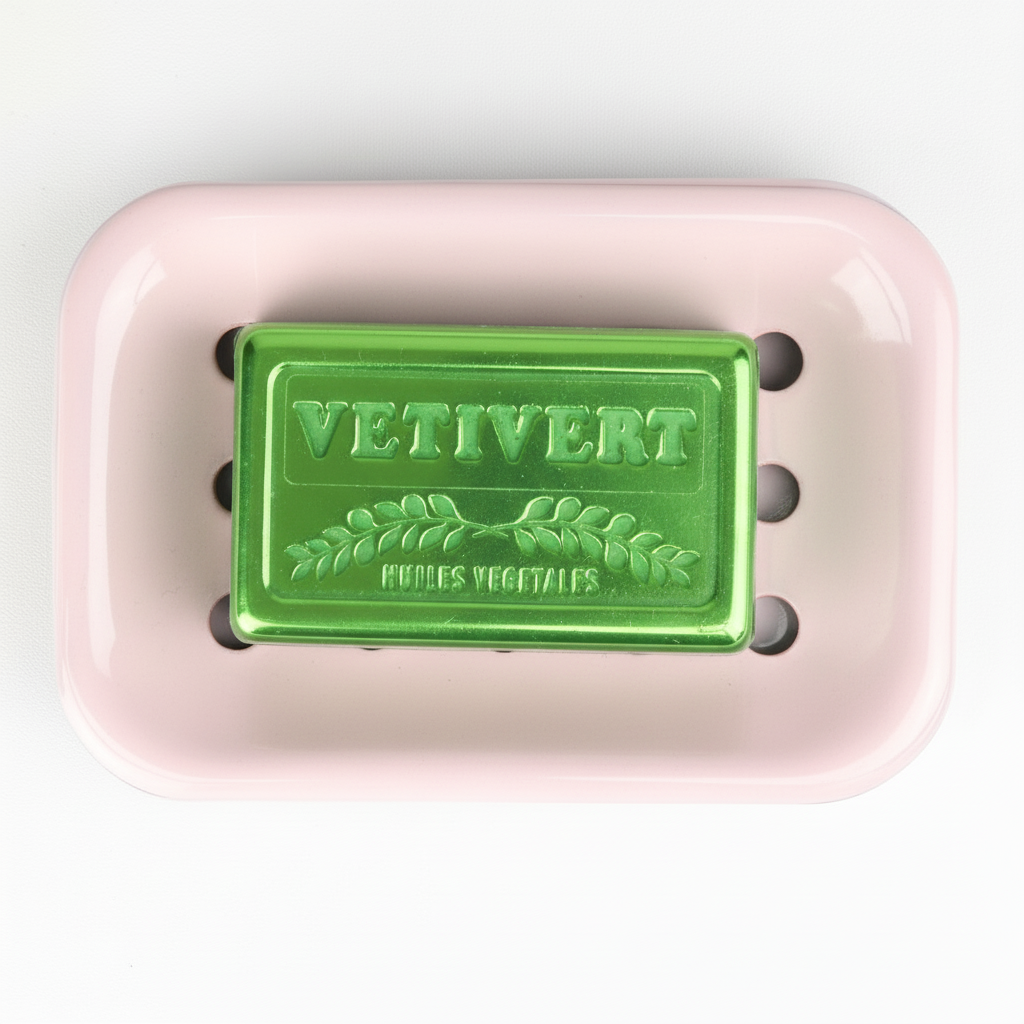 A rectangular soap dish in a soft pink and made from high quality steel. The dish itself comes in two parts; a dish with drainage holes to keep your soap from melting and a dish that goes below to catch the drainage. Handmade, each piece is unique.
