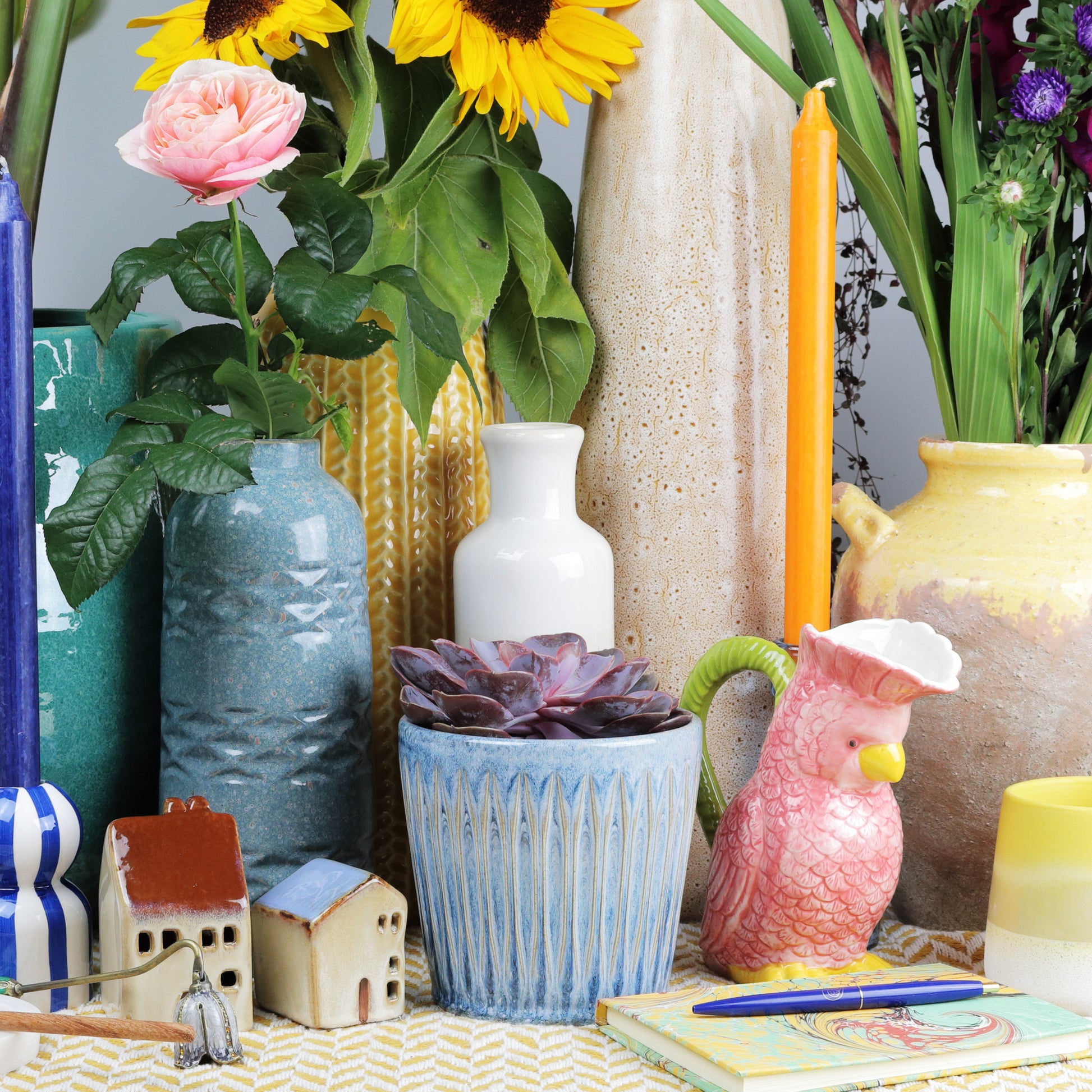 This is a lovely plant pot, inspired by the summer sky. Glazed in a vibrant azure blue, with an embossed finned pattern throughout, the cone is quite a striking piece. A base glaze in honey brown accentuates the detail of the form and adds depth to the aesthetic. Handmade, each piece is unique. Sealed, no drainage holes. Available in two sizes.