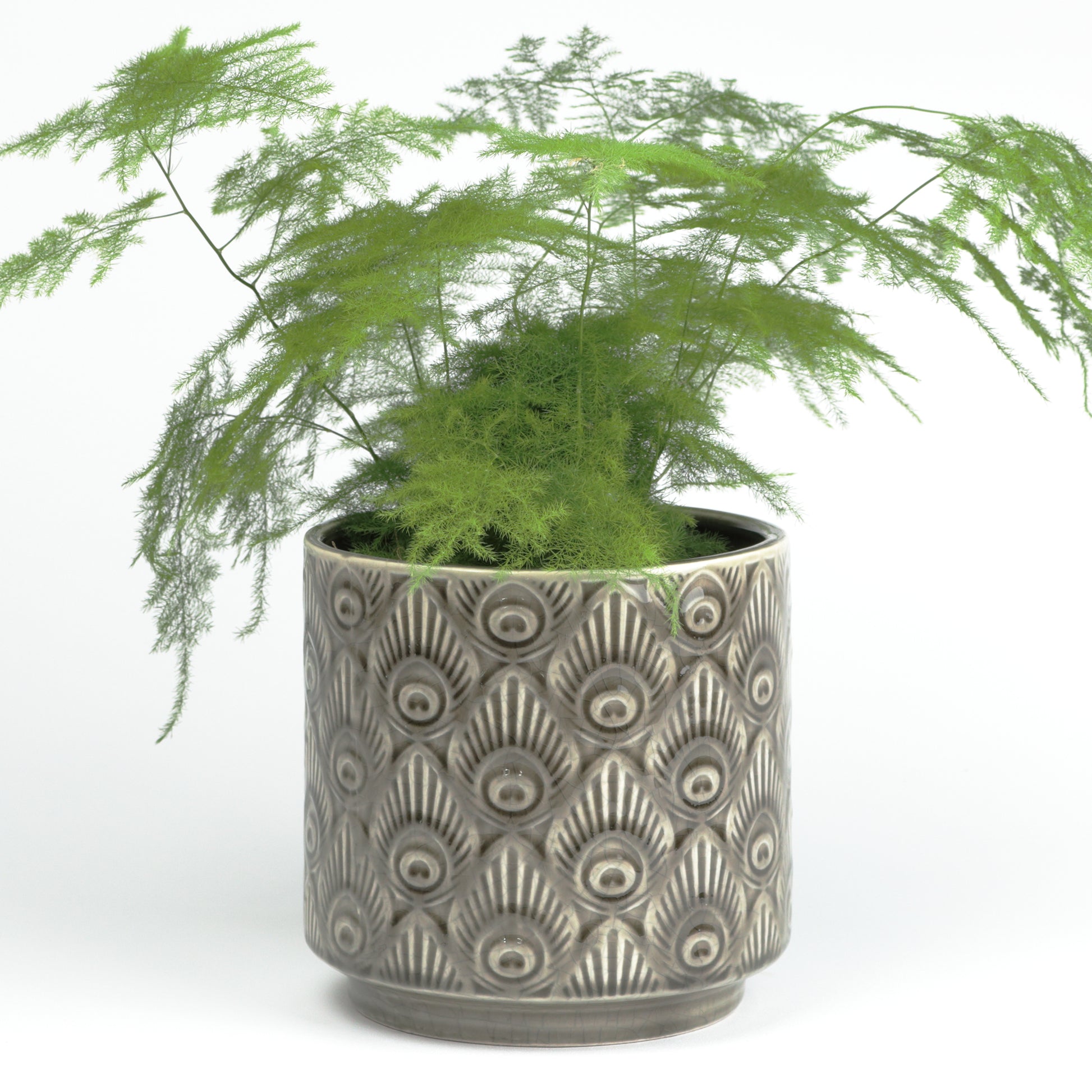 A quirky plant pot with a peacock feather pattern embossed throughout its surface. It comes in a cylinder shape, with an indented base. Glazed in a gentle taupe colour with a white base, picking out the details of the pattern. Handmade, each piece is unique. Sealed, no drainage holes. Available in two sizes.