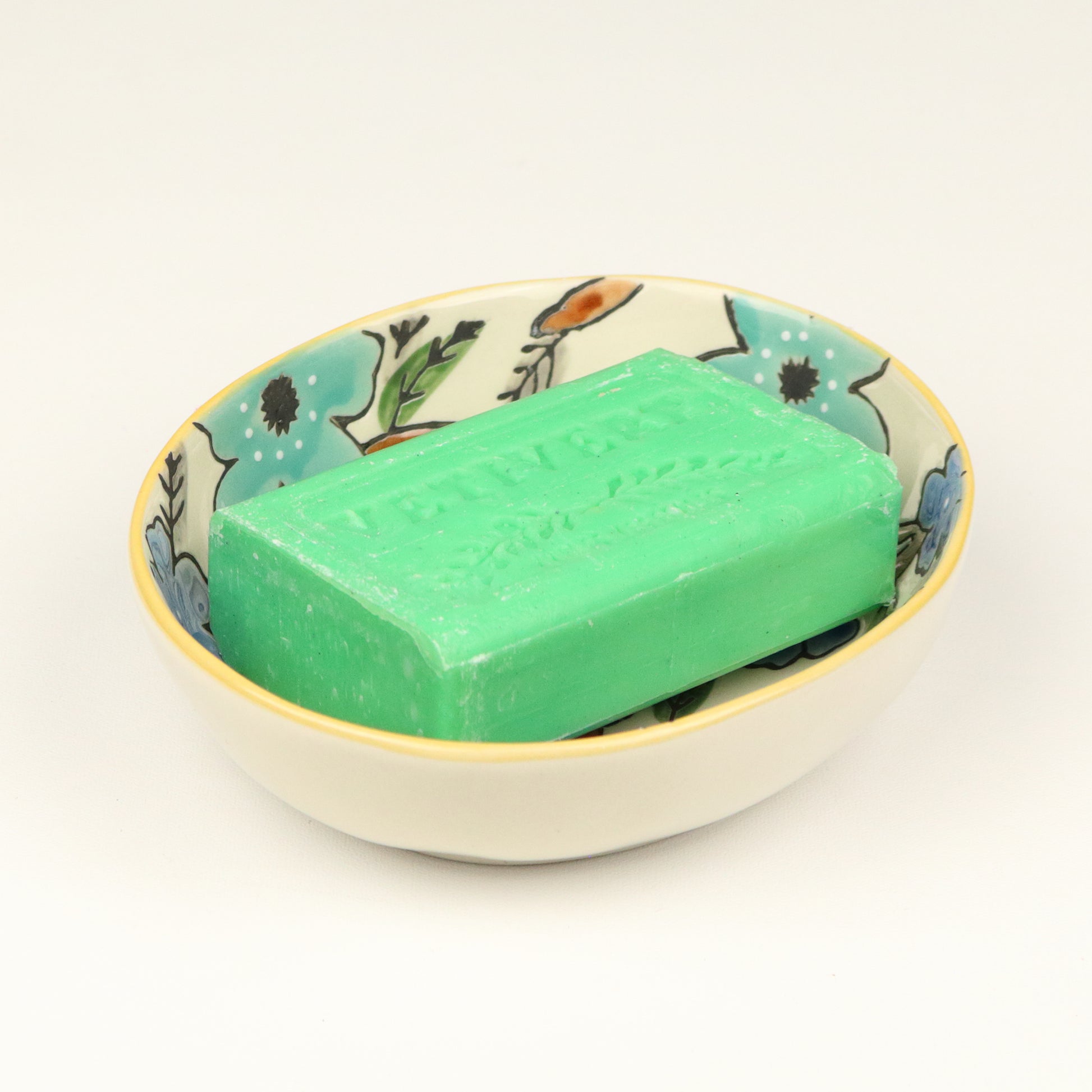 A round soap dish with a yellow rim and a pattern formed from aqua flowers and stems around centred drainage holes. Handmade, each piece is unique.