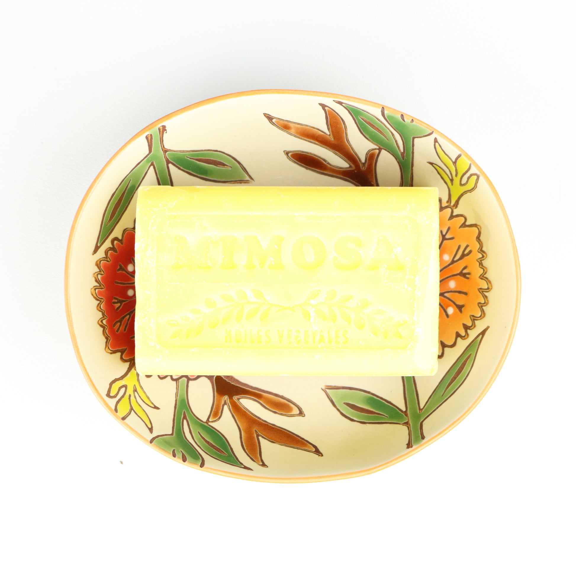 A round soap dish with an orange rim and a pattern formed from two colourful daffodils around centred drainage holes. Handmade, each piece is unique.