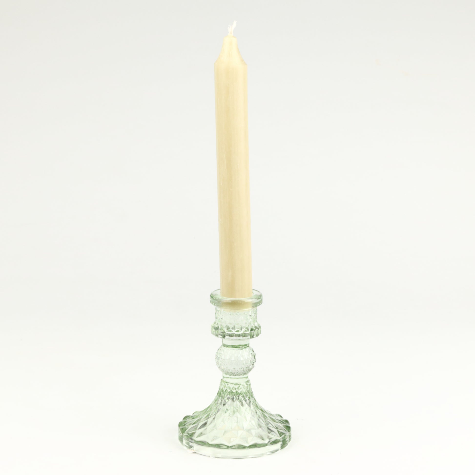 This charming glass candlestick holds one standard size candle and will make the perfect addition to your dinner table or wherever you fancy. Handmade, each piece is unique.