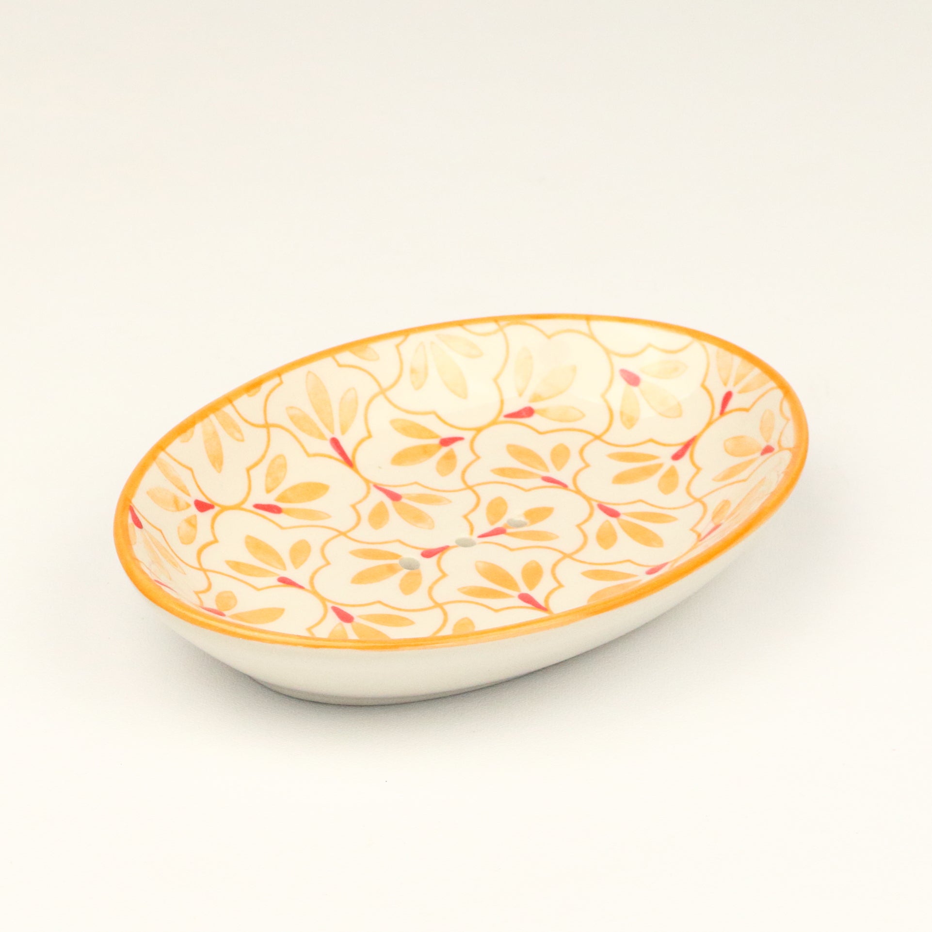An oval shaped soap dish with an orange rim and a pattern formed from an exquisite mix of orange petals, lines and crimson droplets, around centred drainage holes. Handmade, each piece is unique.