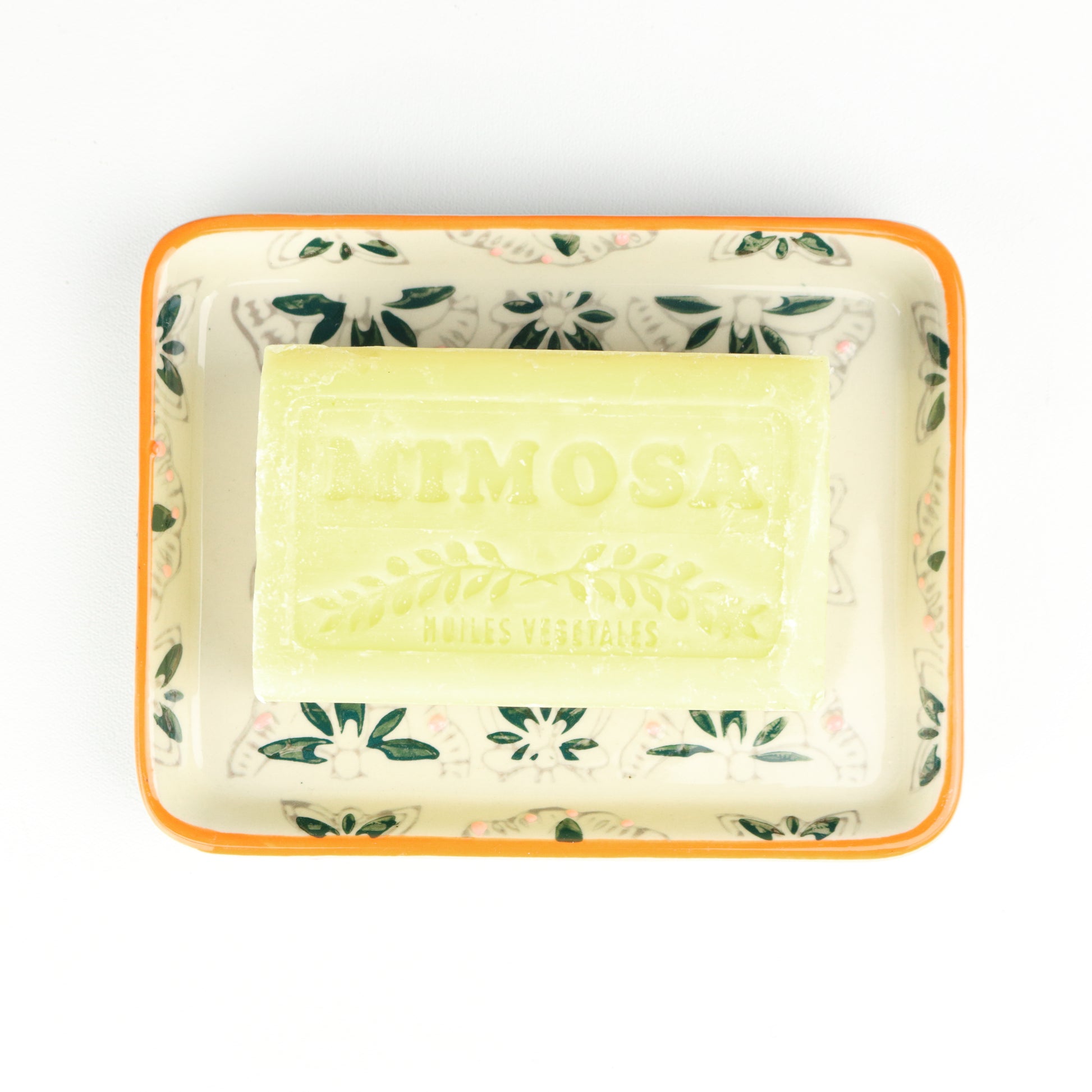 A vibrantly rimmed rectangular soap dish, with a racing green leafy pattern on an ivory backdrop and drainage holes. Handmade, each piece is unique.