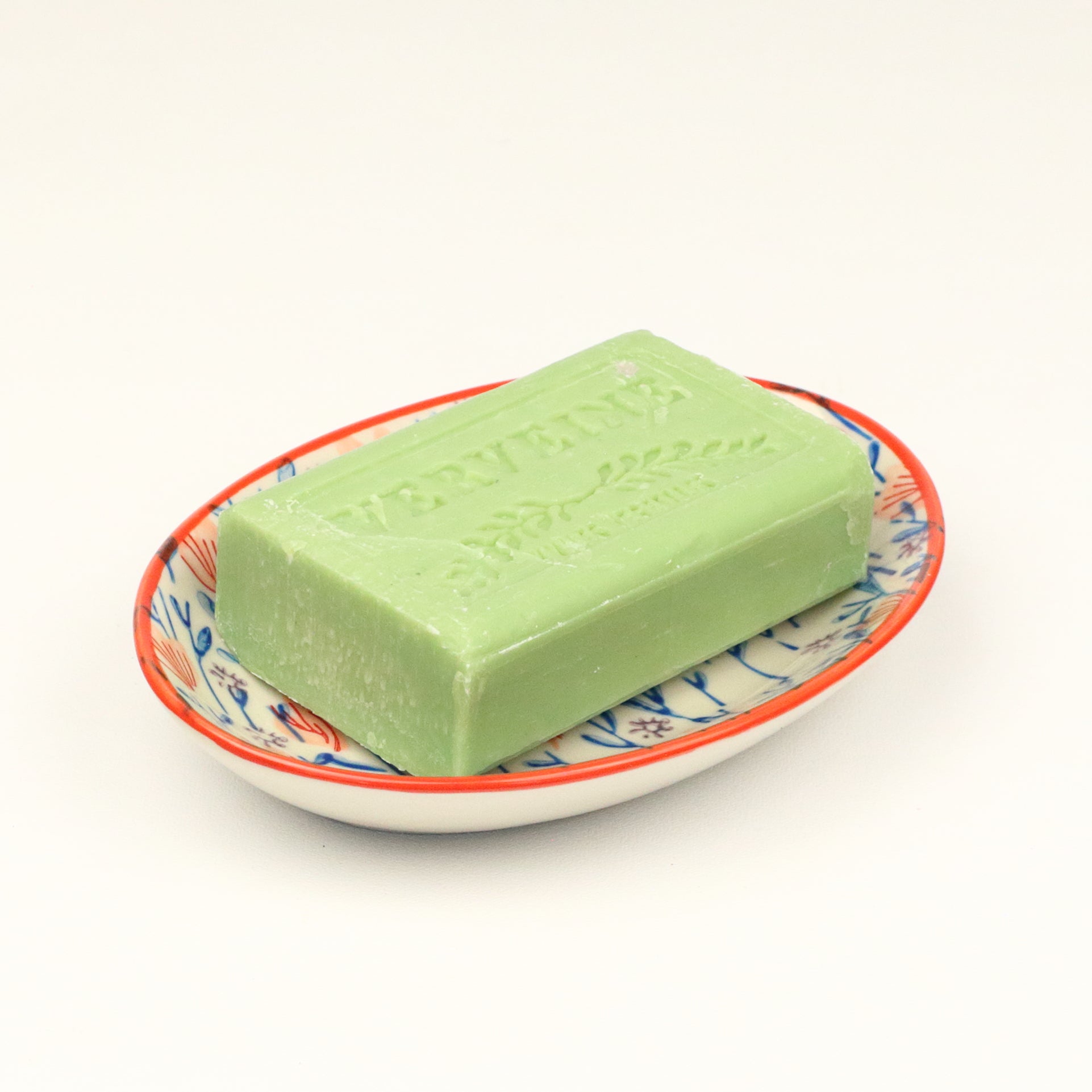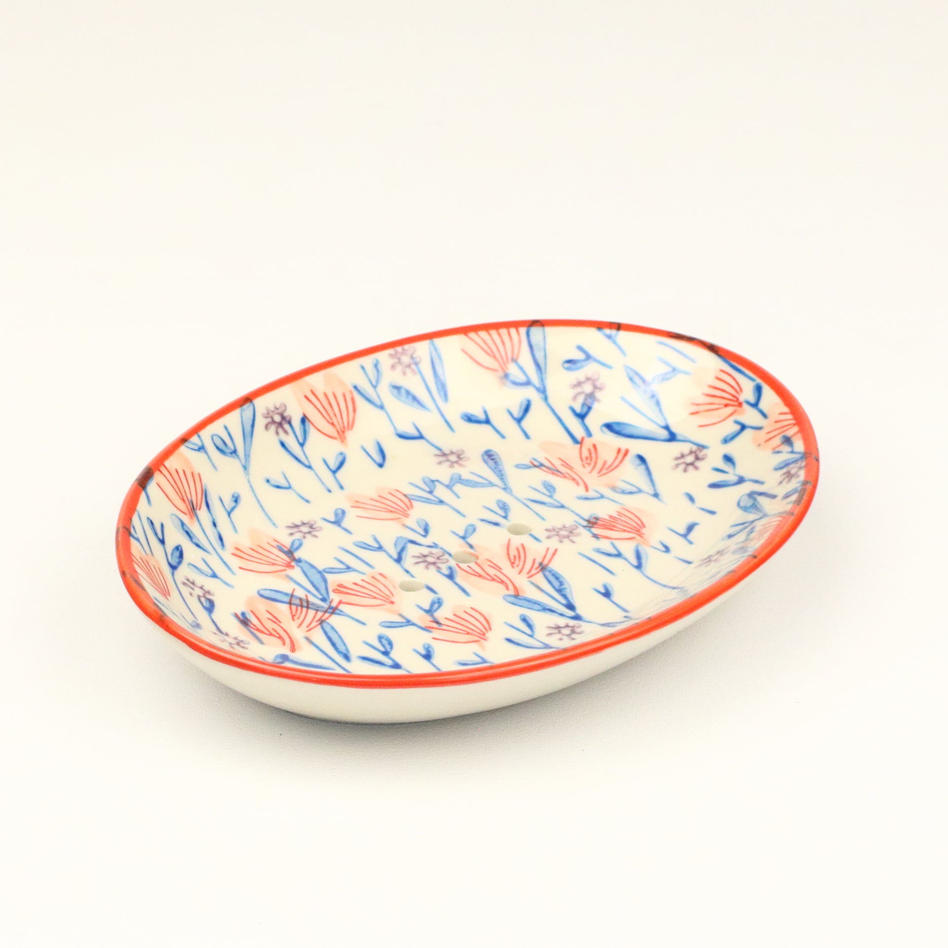 An oval shaped soap dish with a vibrant red rim and a pattern featuring blue flower stems and scarlet petals, around centred drainage holes. Handmade, each piece is unique.
