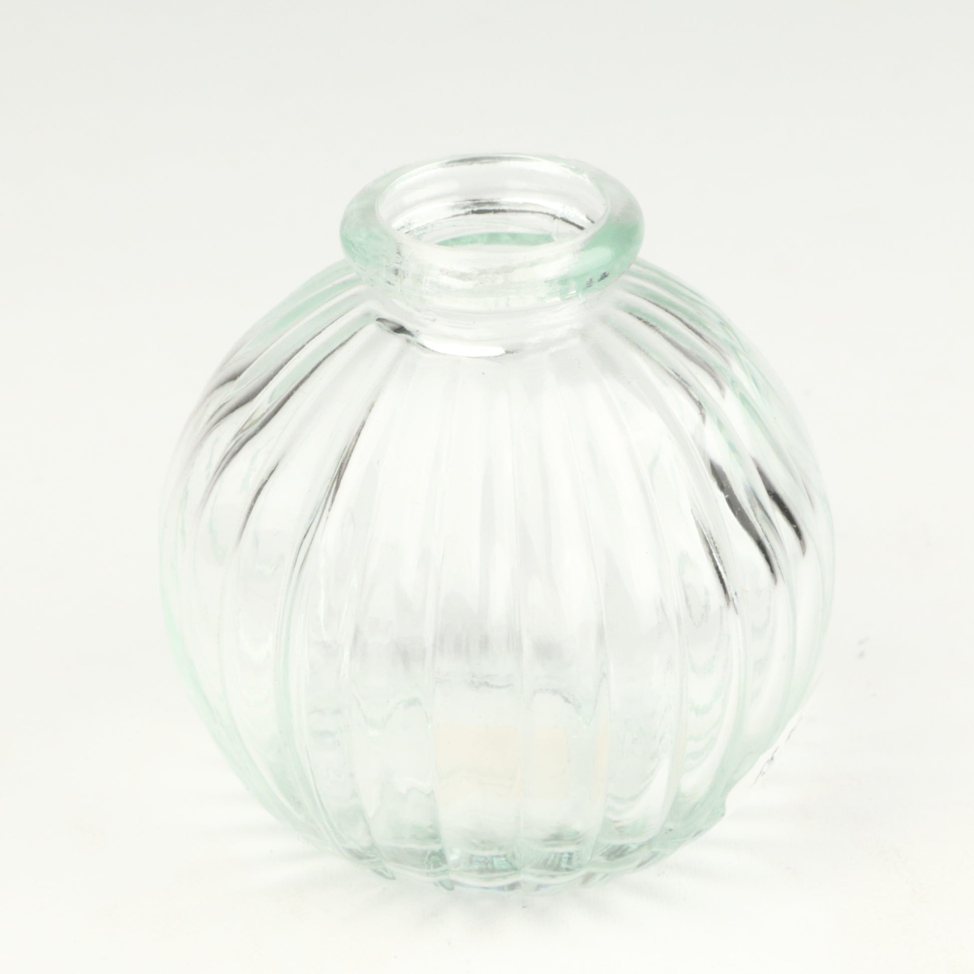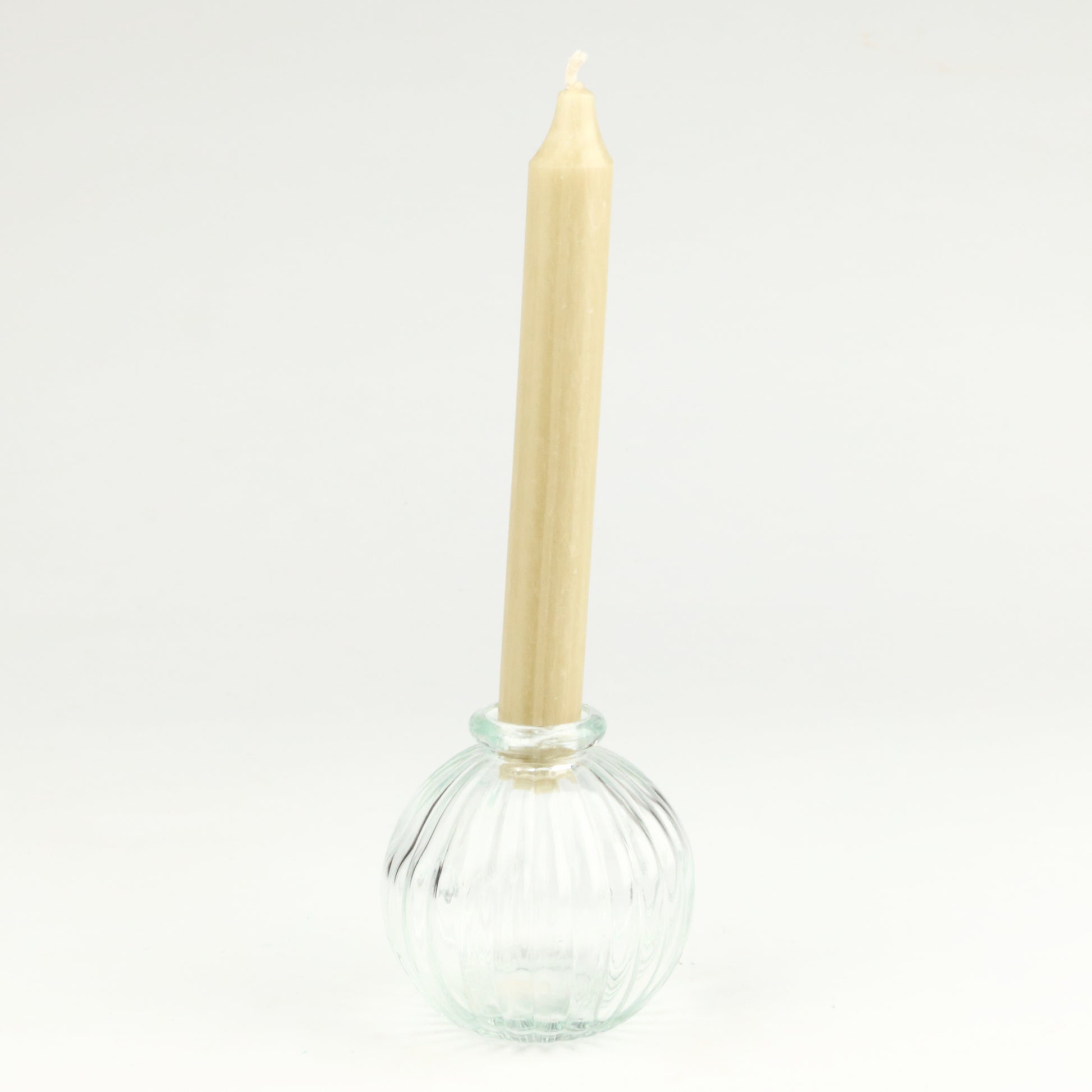 This candlestick's distinctive ribbed glass texture catches light beautifully, creating an elegant focal point for any room. The refined spherical silhouette brings contemporary sophistication to traditional candlelit ambiance. A versatile piece that complements both modern and classic interiors. Handmade, each piece is unique.