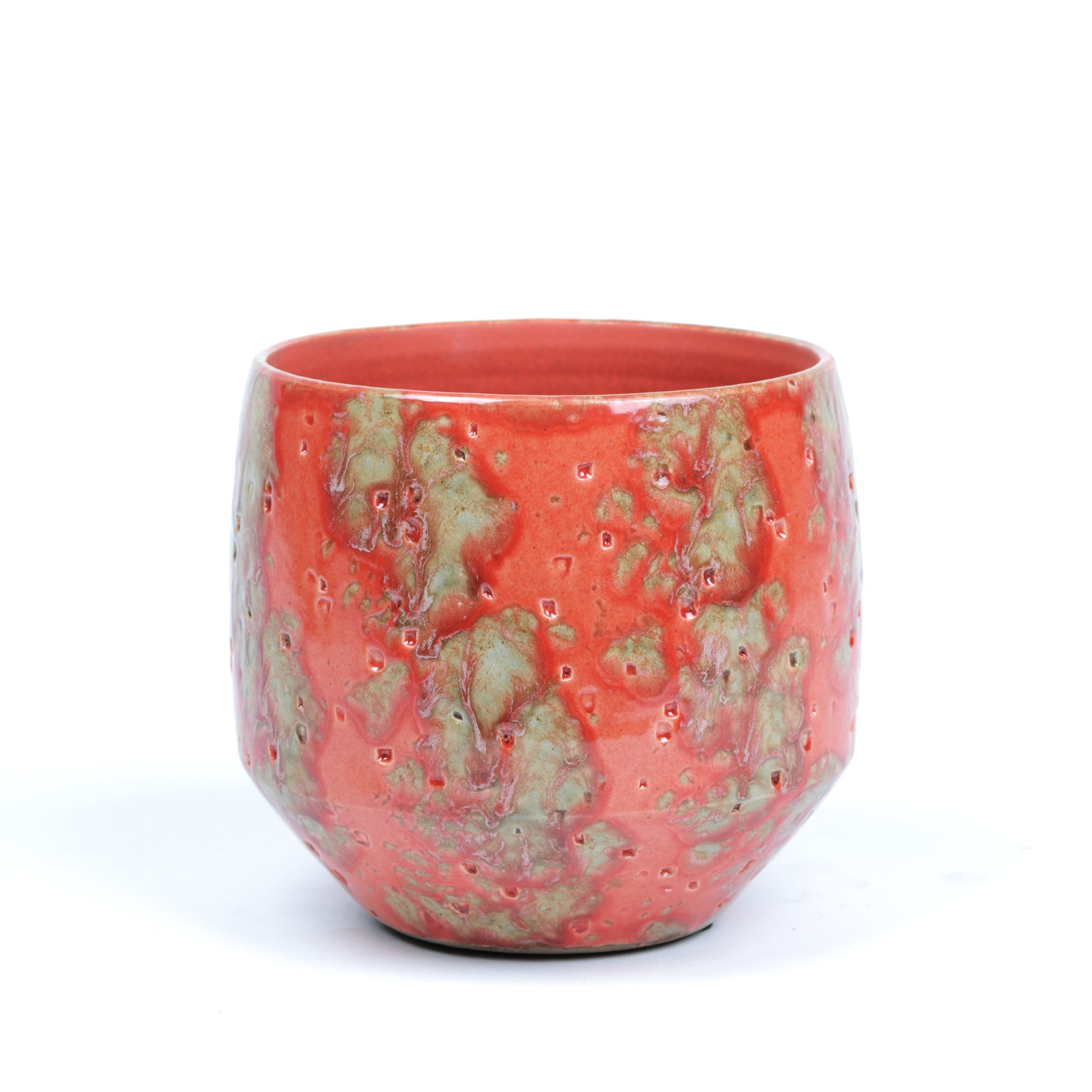 A bold yet charming planter, perfect for adding a touch of personality to your indoor foliage. This piece features a striking coral-red glaze, accented with textured mossy patches that create a unique, organic feel. Subtle pitting across the surface adds depth and interest, while the rounded shape offers a soft, modern silhouette. Handmade, each piece is unique. Sealed, no drainage holes. Available in three sizes.