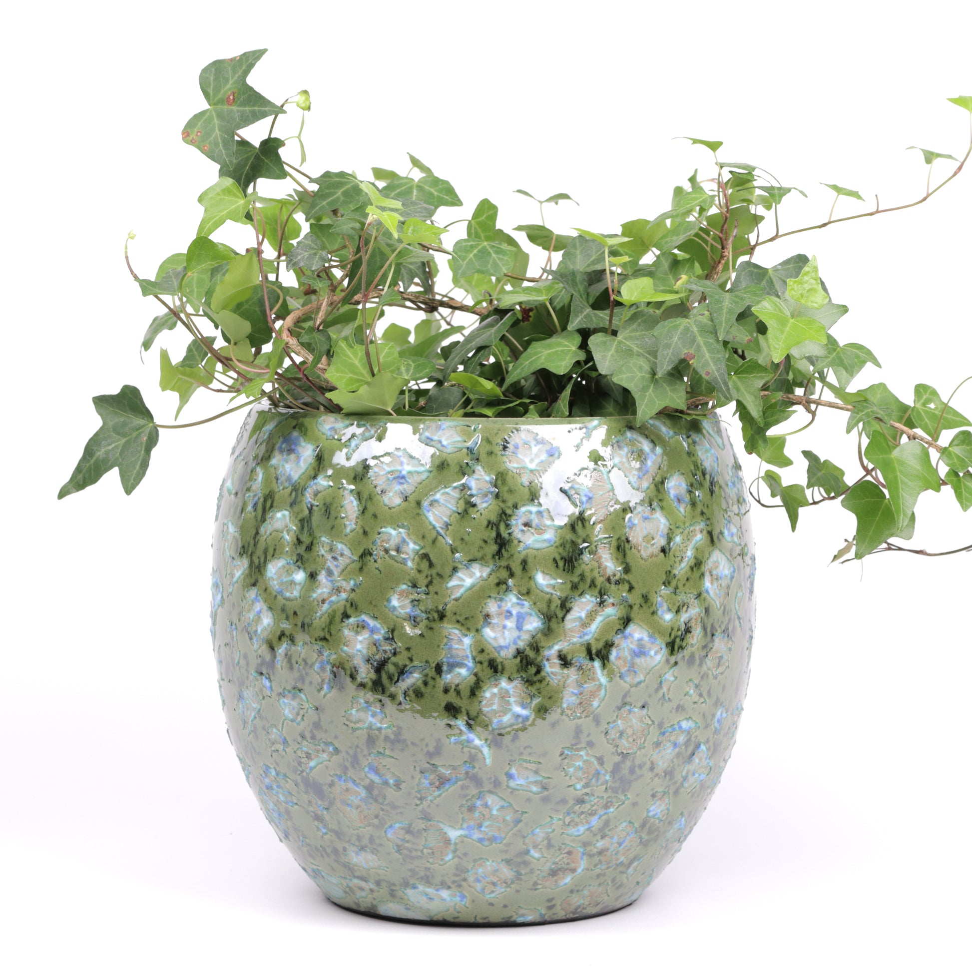 A beautifully rounded pot showcasing a dynamic crystalline glaze. Soft greens blend with icy blues in organic, petal-like formations that shimmer beneath a glossy surface. Each piece reveals its own unique pattern, reminiscent of natural mineral textures and flowing landscapes. Handmade, each piece is unique. Sealed, no drainage holes.