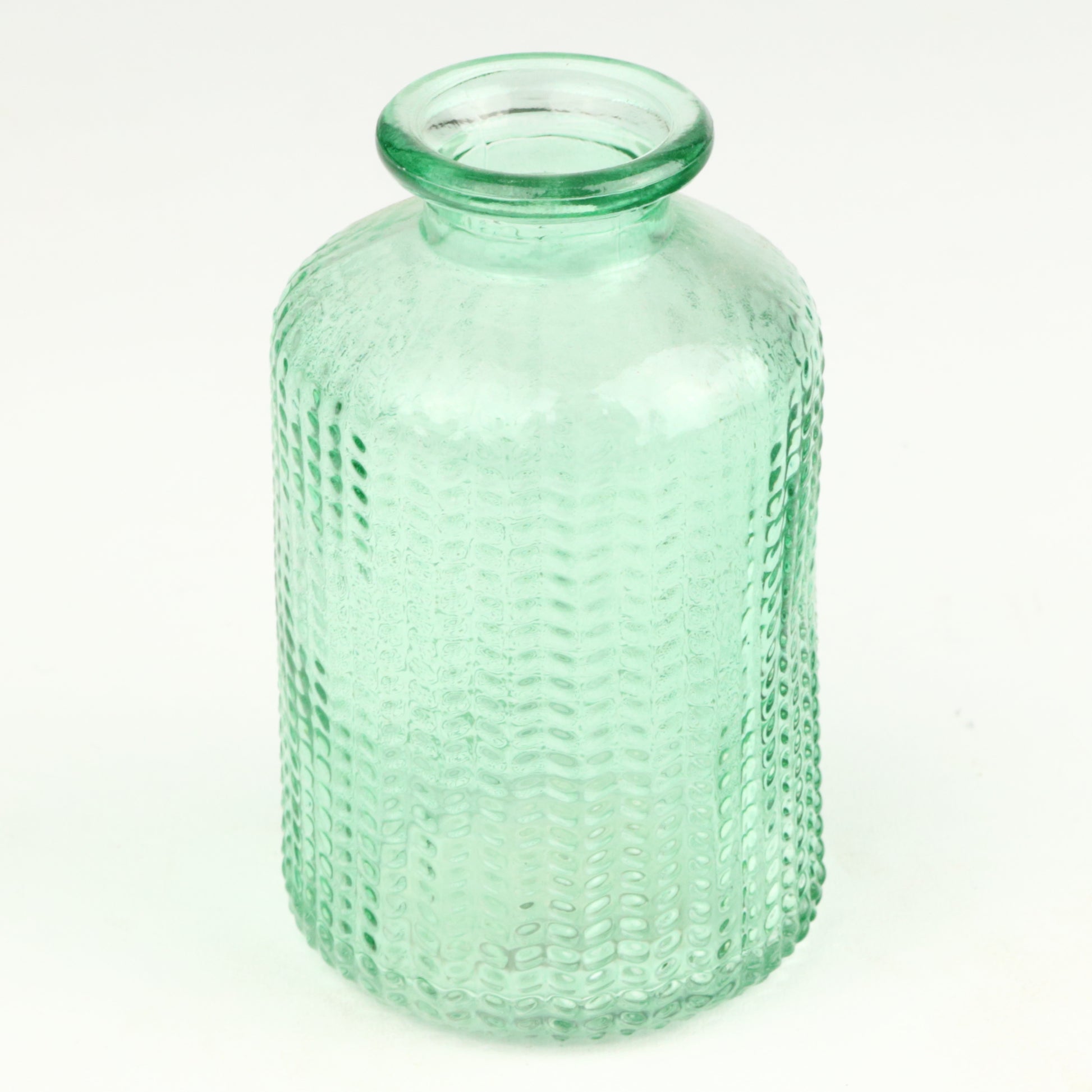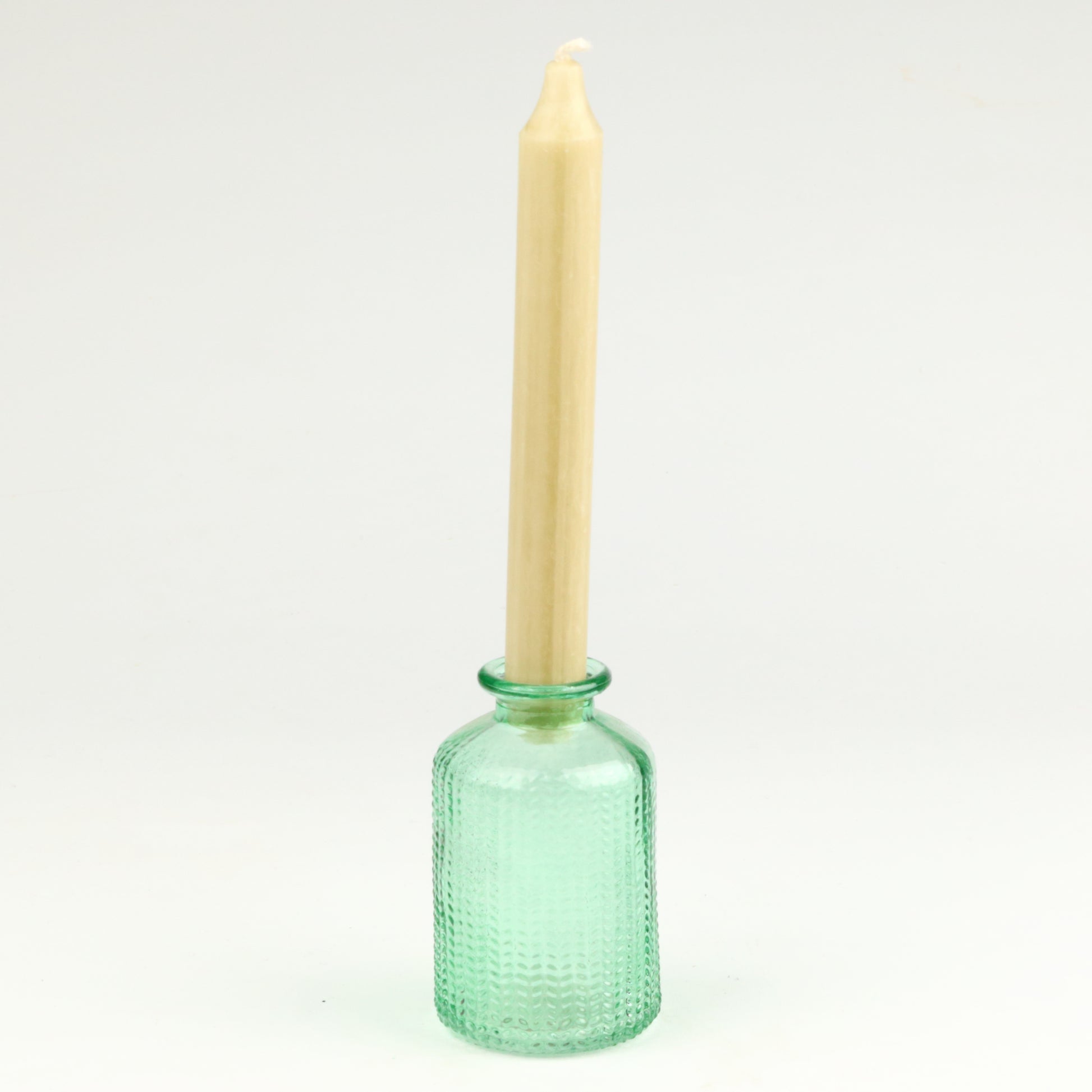 This candlestick's distinctive herringbone glass texture catches light beautifully, creating an elegant focal point for any room. The refined cone silhouette brings contemporary sophistication to traditional candlelit ambiance. A versatile piece that complements both modern and classic interiors. Handmade, each piece is unique.