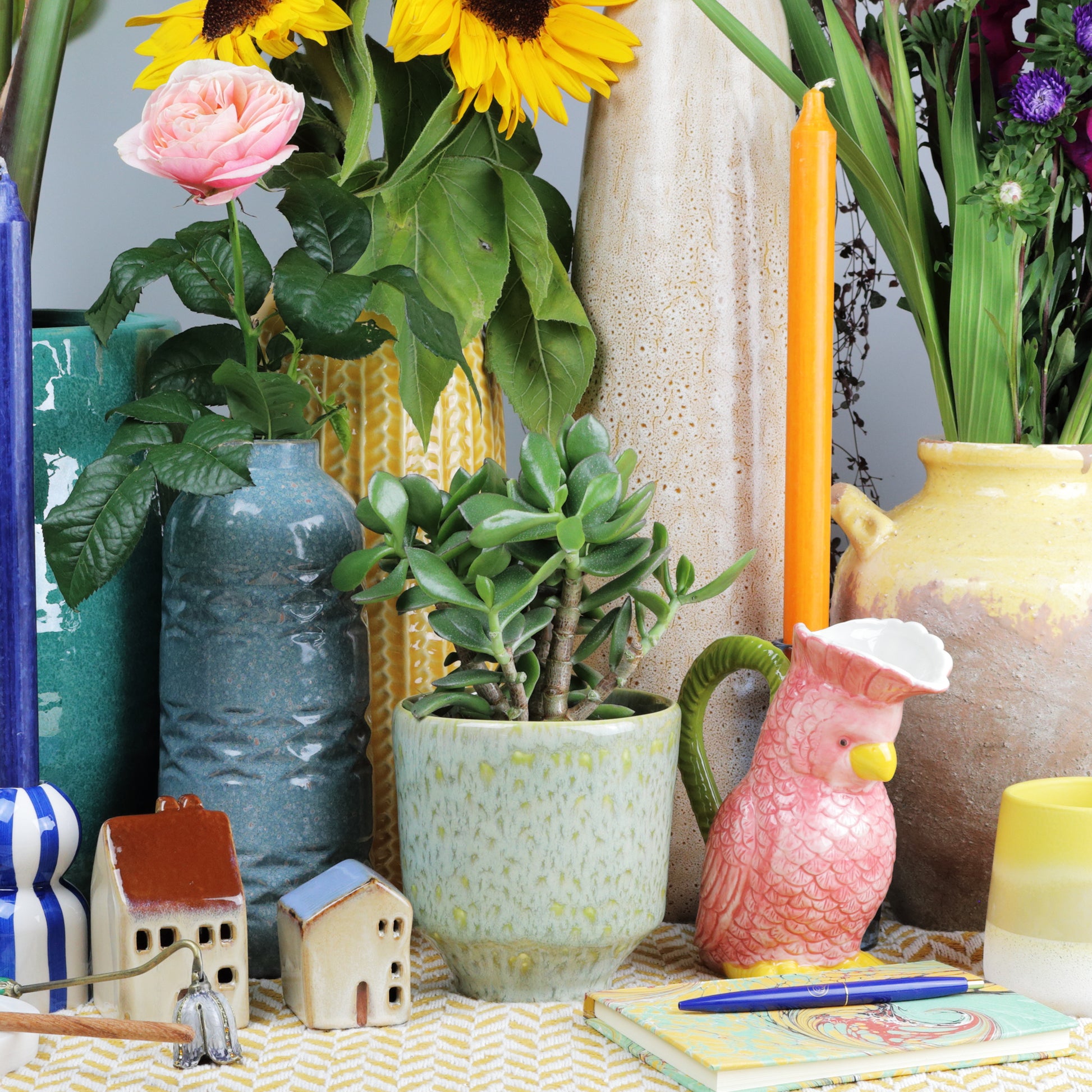 This is an elegant plant pot, with a sophisticated mint green brown base glaze, and mottled golden yellow finishing, giving the piece a lot of character. The shape is gently tapered, with a lift at the base with a sharp inward incline, allowing for plenty of space for your plants. Handmade, each piece is unique. Sealed, no drainage hole.