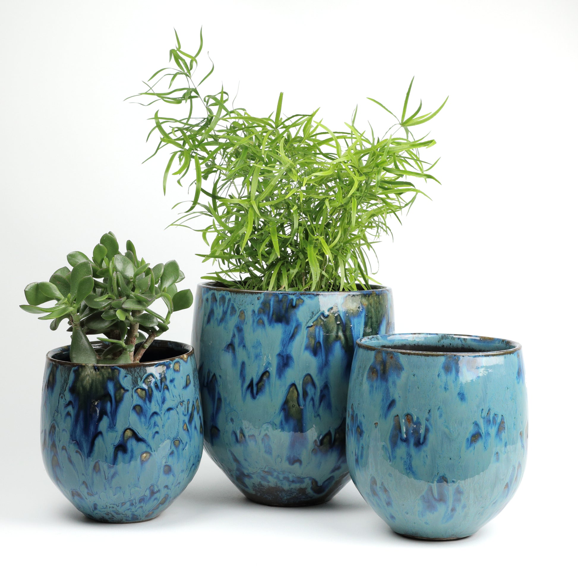 A bold and captivating plant pot with a flowing glaze. Shades of turquoise, deep blue, and aqua cascade across the surface, creating the look of liquid movement frozen in time that is richly expressive and full of depth. Handmade, each piece is unique. Sealed, no drainage holes. Available in three sizes.