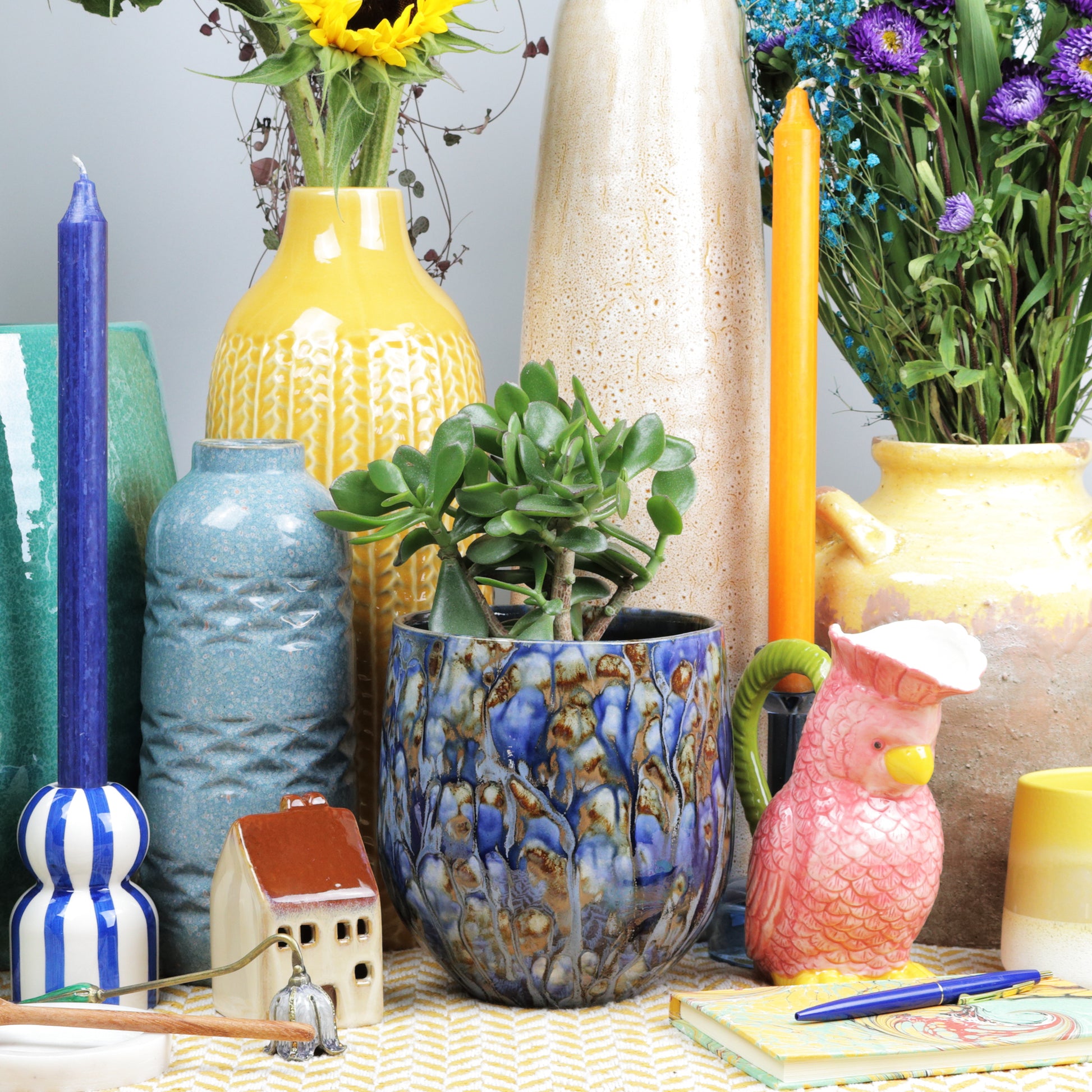 A stunning pot featuring a complex, multi-tonal glaze that feels almost alive. Swirls of deep blue, bronze, and slate grey merge and crystallize across the surface, creating a sense of movement and depth. Its glossy, tactile finish highlights the artistry of the glaze, making each piece truly distinctive. Handmade, each piece is unique. Sealed, no drainage holes. Available in two sizes.
