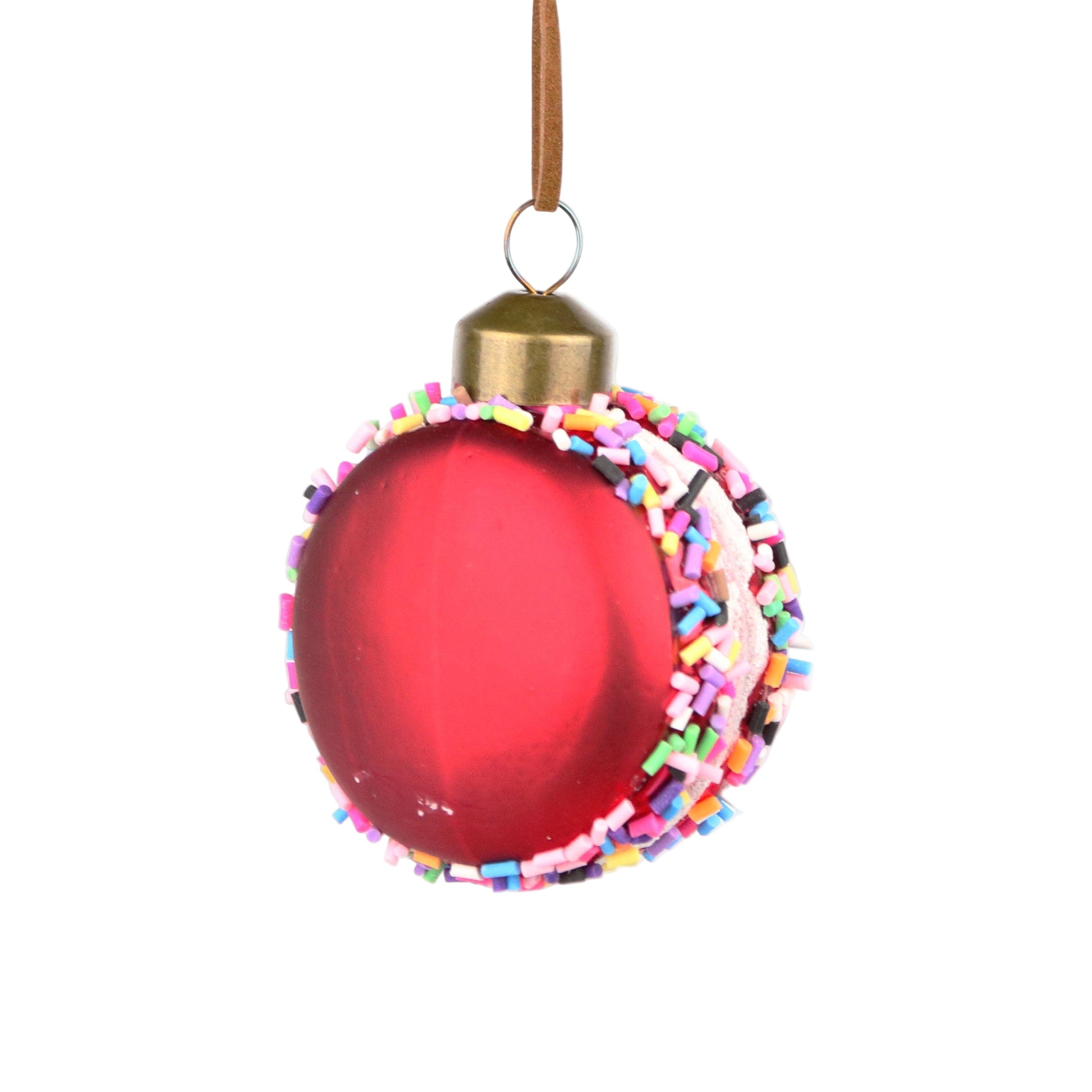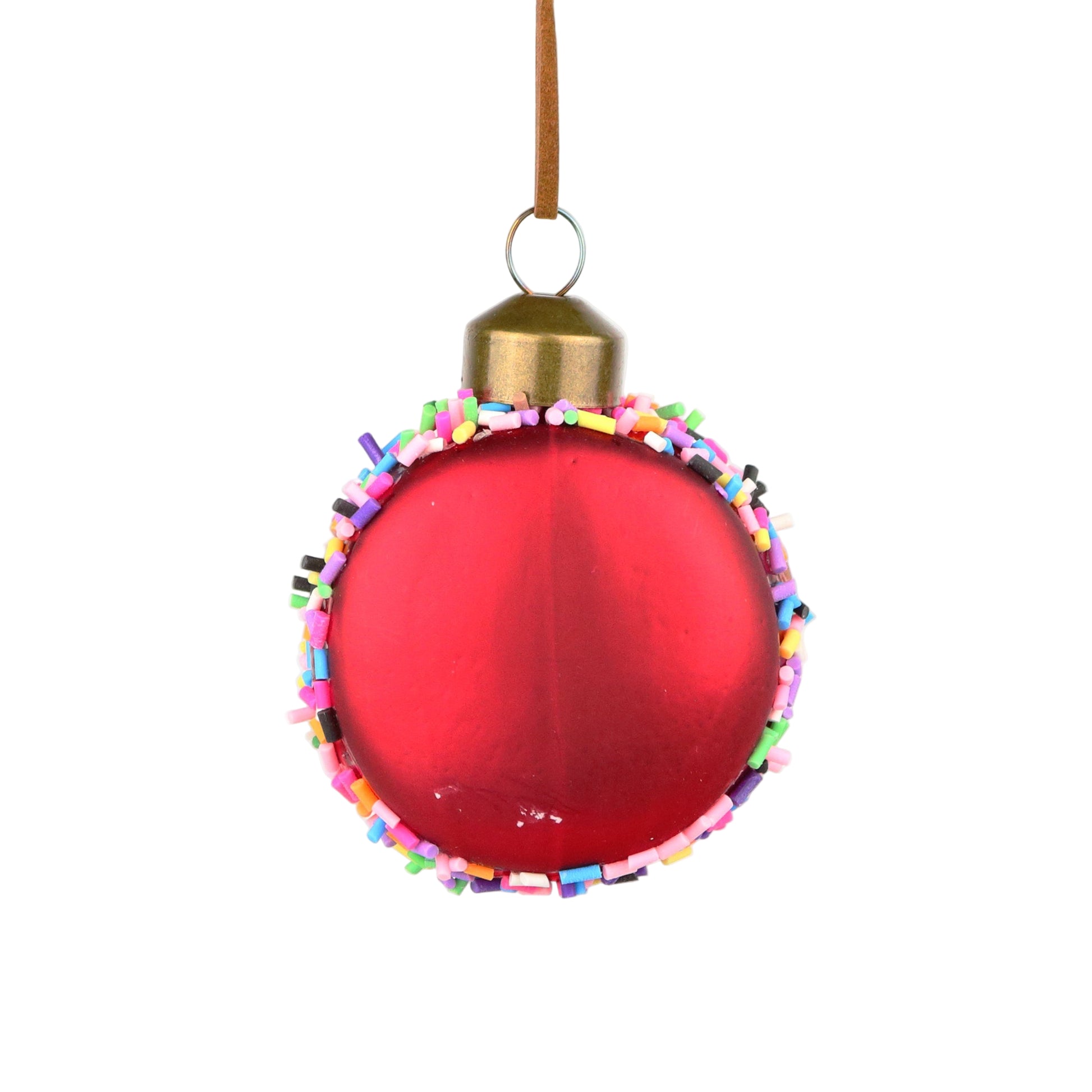 Delicate and charming, this maroon macaron bauble brings a touch of French elegance to your festive décor. Crafted with handblown glass with meticulous attention to detail, the deep rich hue captures the essence of a classic patisserie favourite in miniature form. A delightful fusion of culinary artistry and seasonal sophistication. Handmade, each piece is unique.