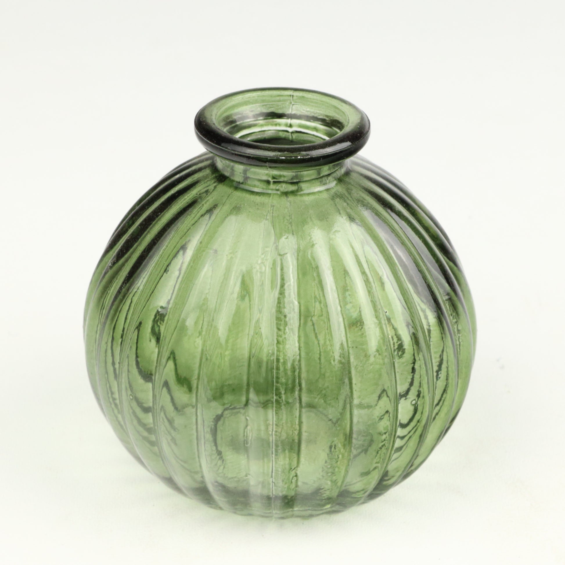 This candlestick's distinctive ribbed glass texture catches light beautifully, creating an elegant focal point for any room. The refined spherical silhouette brings contemporary sophistication to traditional candlelit ambiance. A versatile piece that complements both modern and classic interiors. Handmade, each piece is unique.