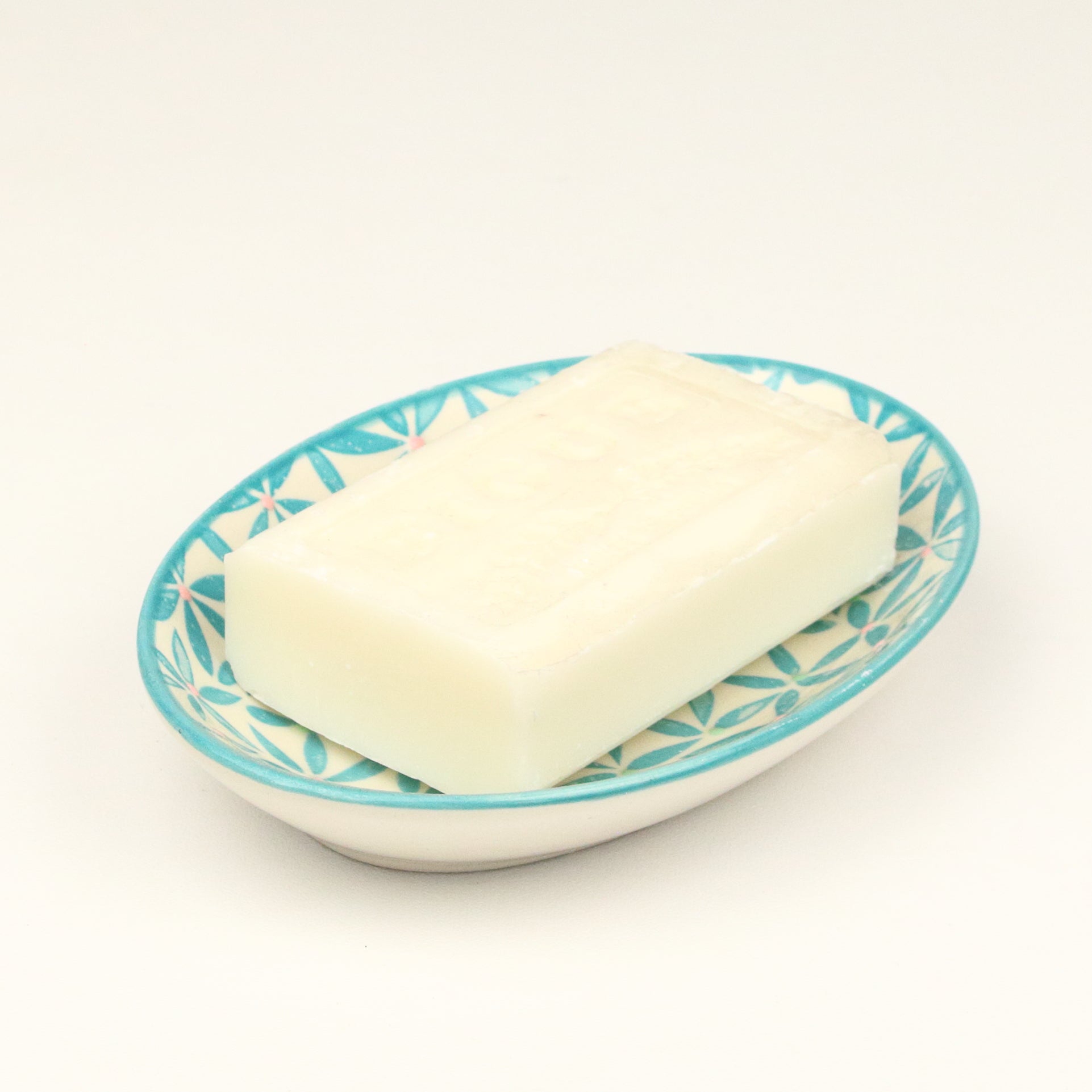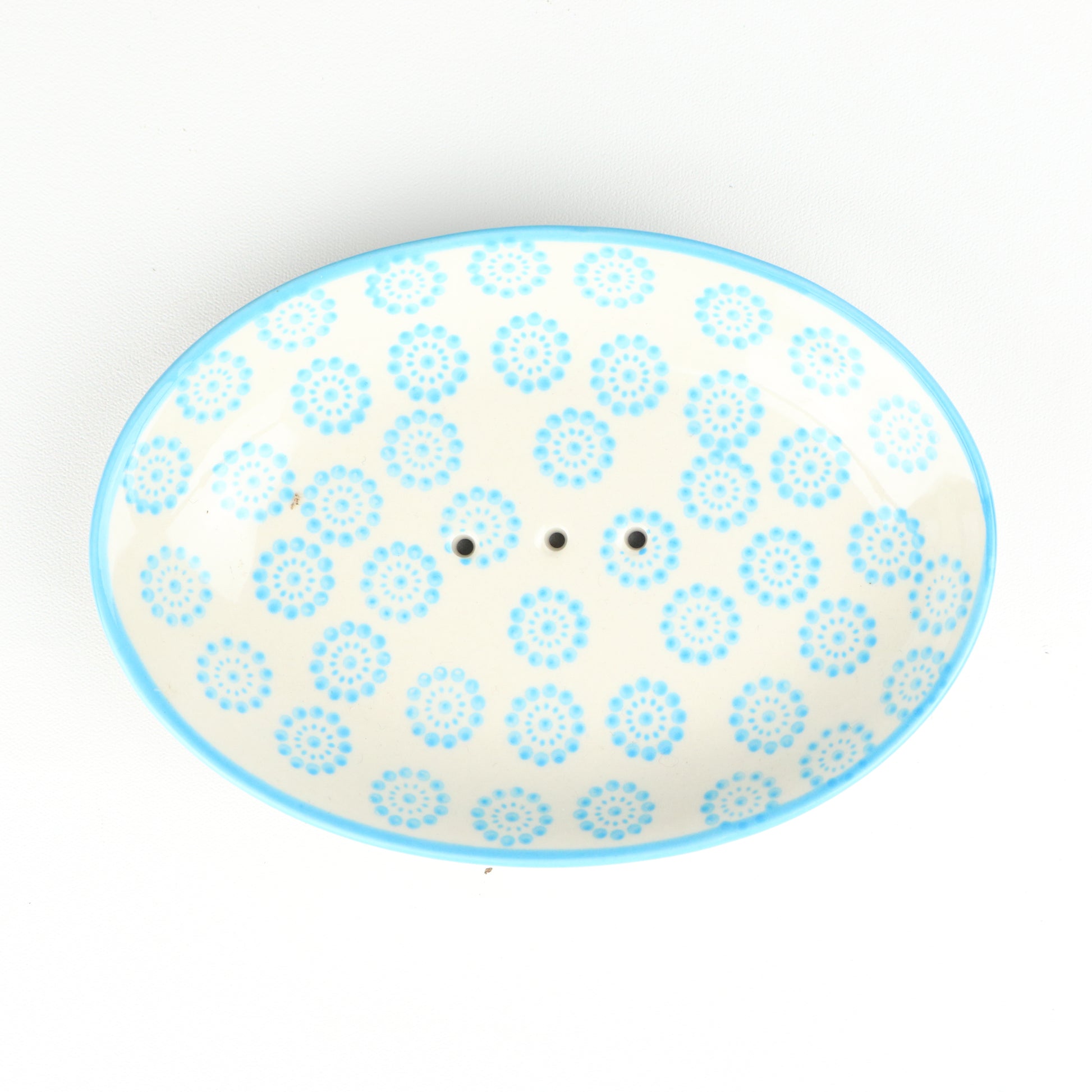 An oval shaped soap dish with an aqua rim and a pattern formed from small concentric circles of cyan dots, around centred drainage holes. Handmade, each piece is unique.