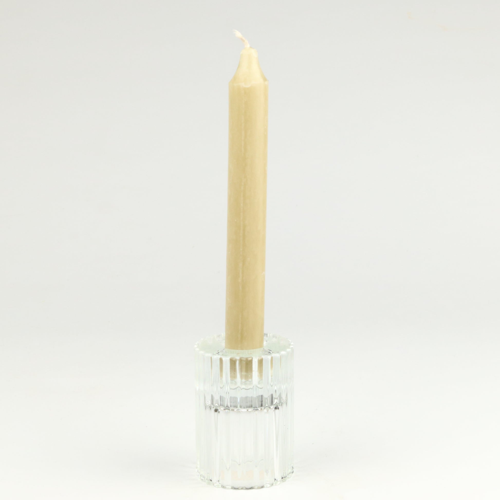 This versatile piece accommodates both dinner candles and tea lights, making it an adaptable addition to any table setting. The clean ribbed finish complements contemporary and classic interiors alike, creating ambient lighting for intimate dinners or quiet evenings. Handmade, each piece is unique.