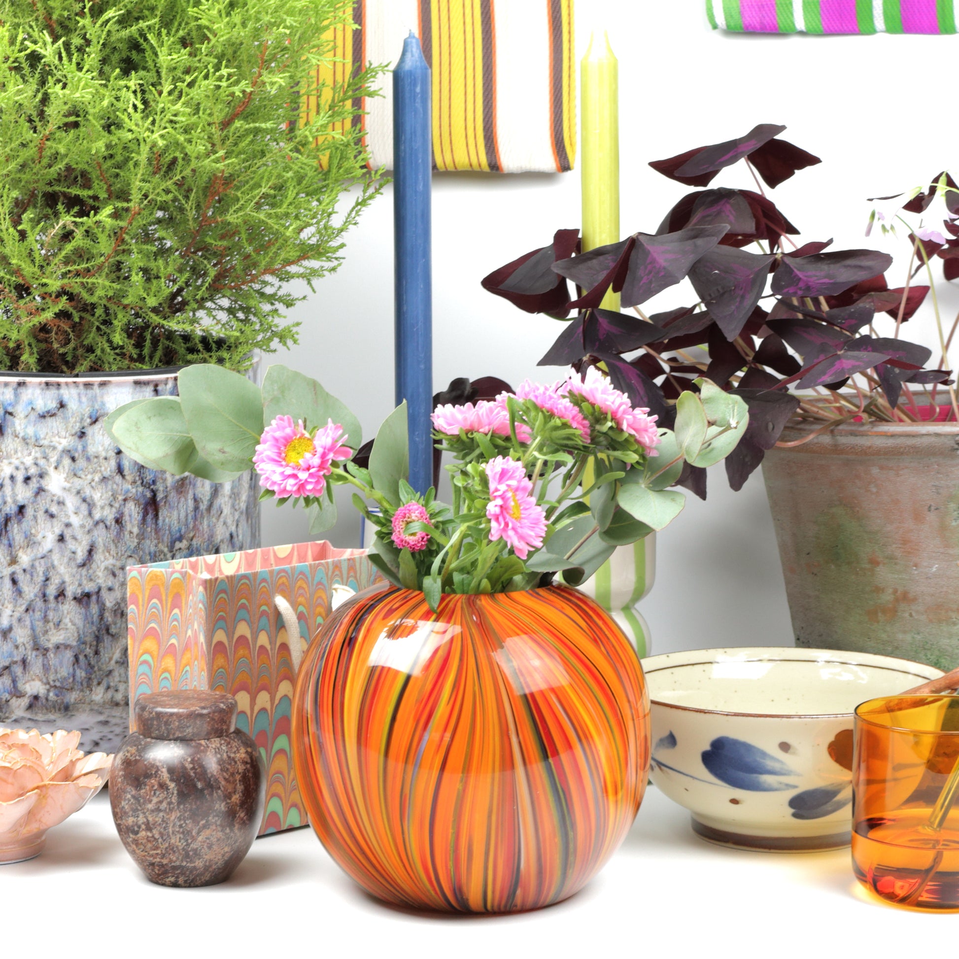 A striking sculptural vase that brings warmth and dimension to any interior. This vibrant sphere showcases a luminous persimmon hue with subtle rainbow undertones, creating an eye-catching focal point whether displayed alone or grouped with complementary pieces. Its rounded form and glossy finish catch light beautifully, making it equally compelling as a standalone art object or functional vessel for fresh blooms. Handmade, each piece is unique.