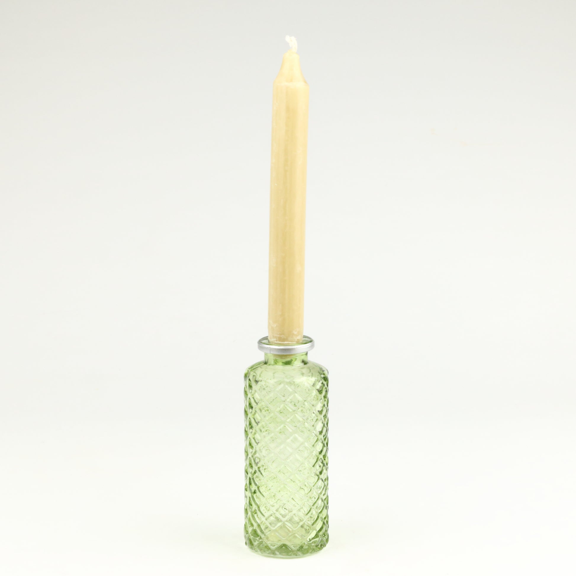 Crafted to accommodate standard sized candles, this charming bottle combines refined proportions and thoughtful construction, to make it an ideal choice for layering ambient warmth into dining rooms, living spaces, or seasonal displays. Handmade, each piece is unique.