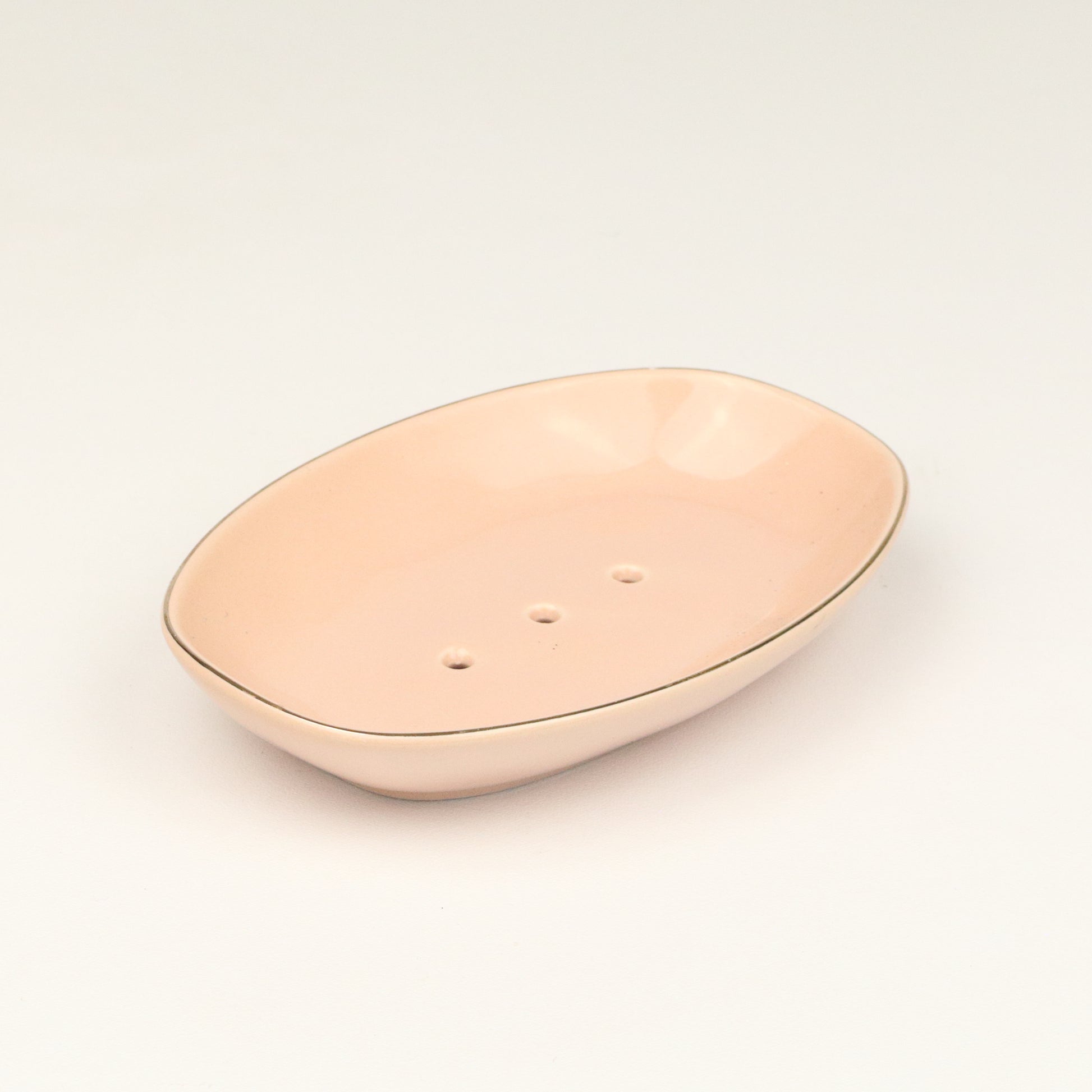 An oval soap dish with an exquisite gold rim and drainage holes on a pale rose body. Handmade, each piece is unique.