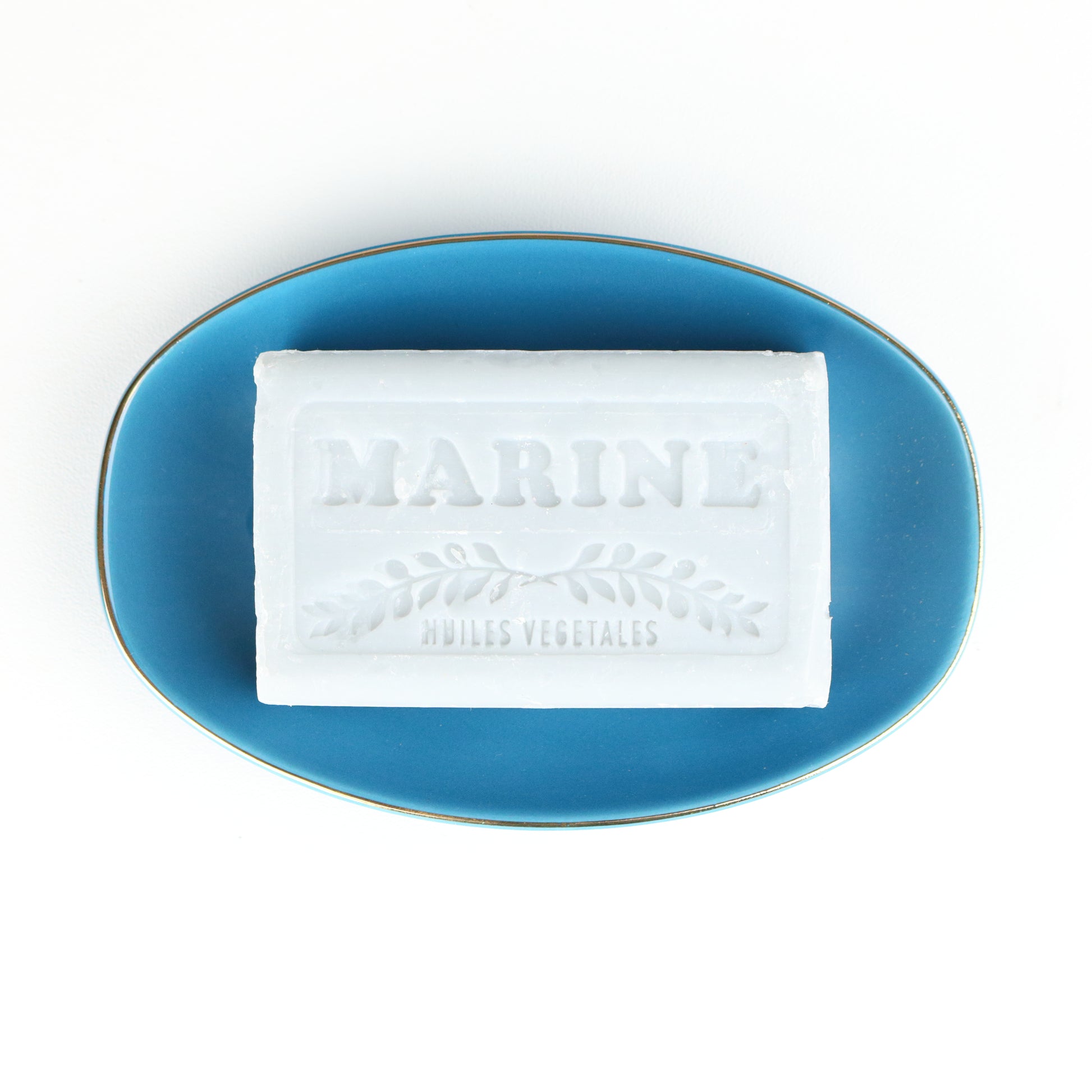 An oval soap dish with an exquisite gold rim and drainage holes on a rich cerulean body. Handmade, each piece is unique.