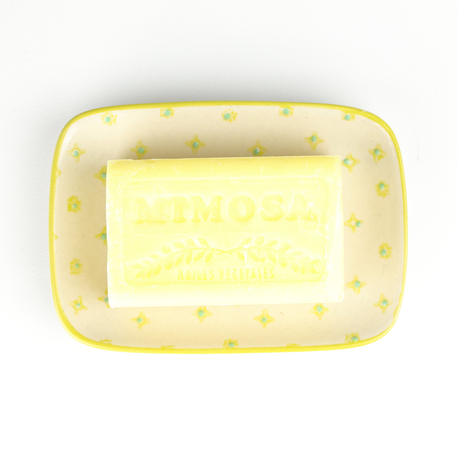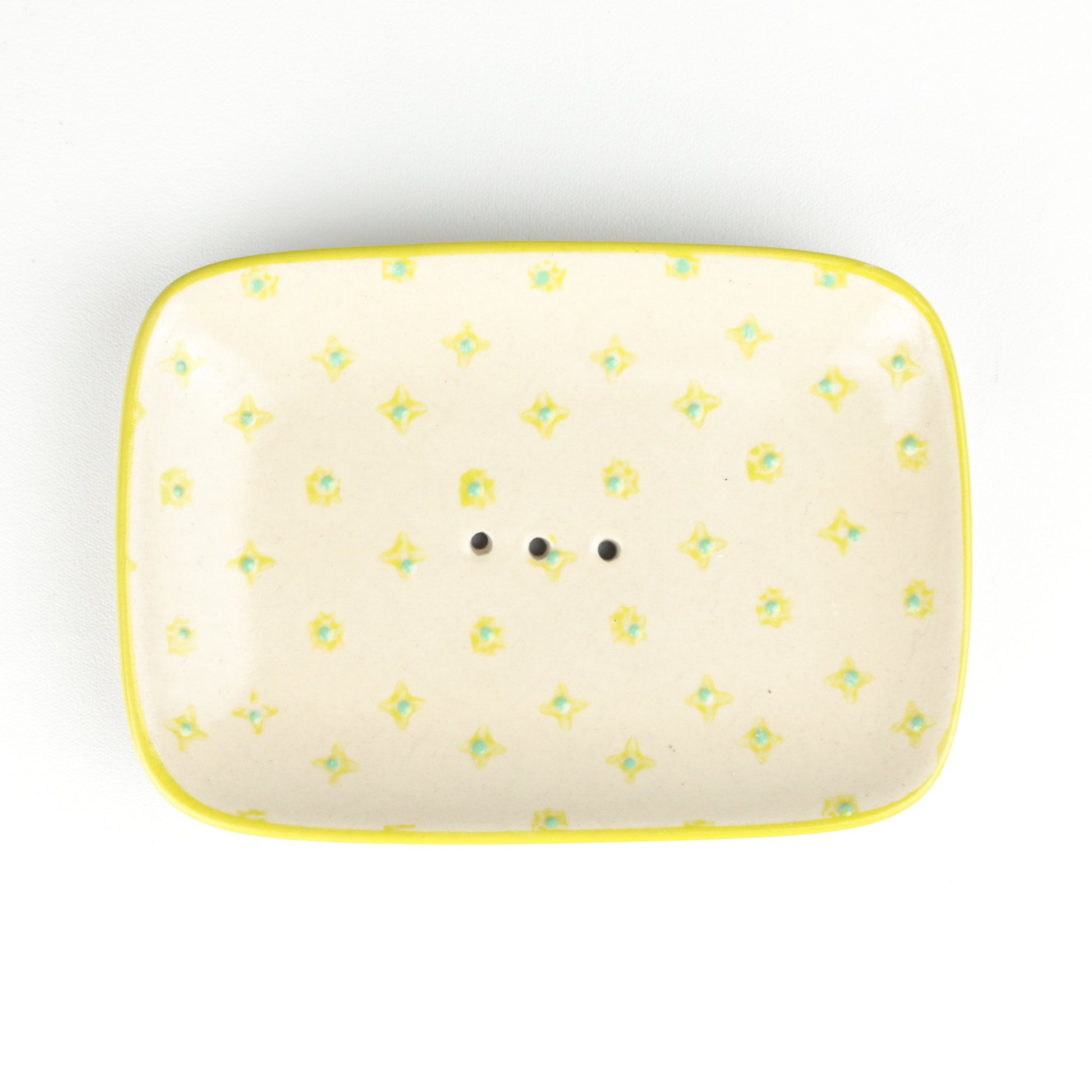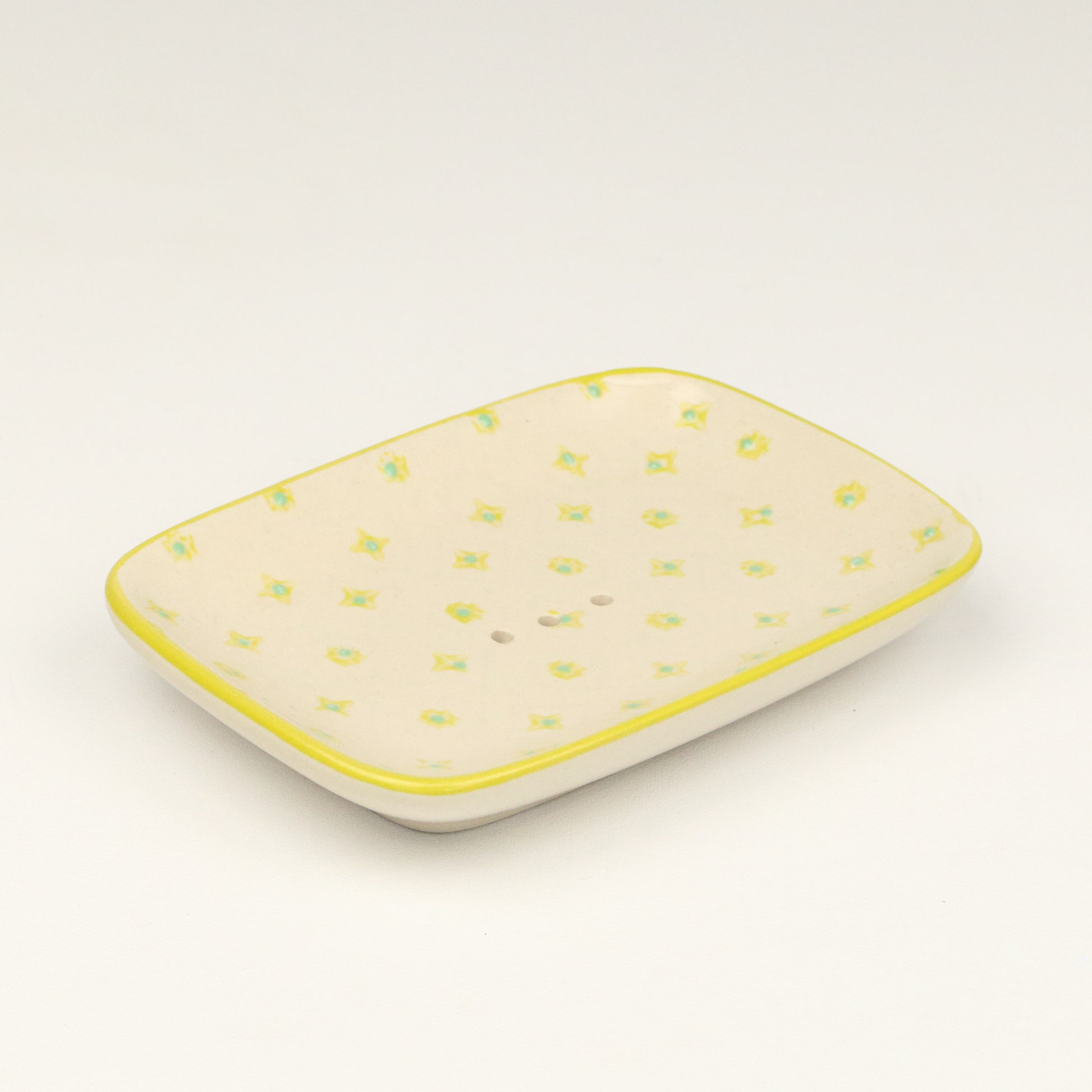 A rectangular soap dish with curved edges and a soft yellow rim. The body of the dish is decorated with lemon and lime dots around centred drainage holes. Handmade, each piece is unique.