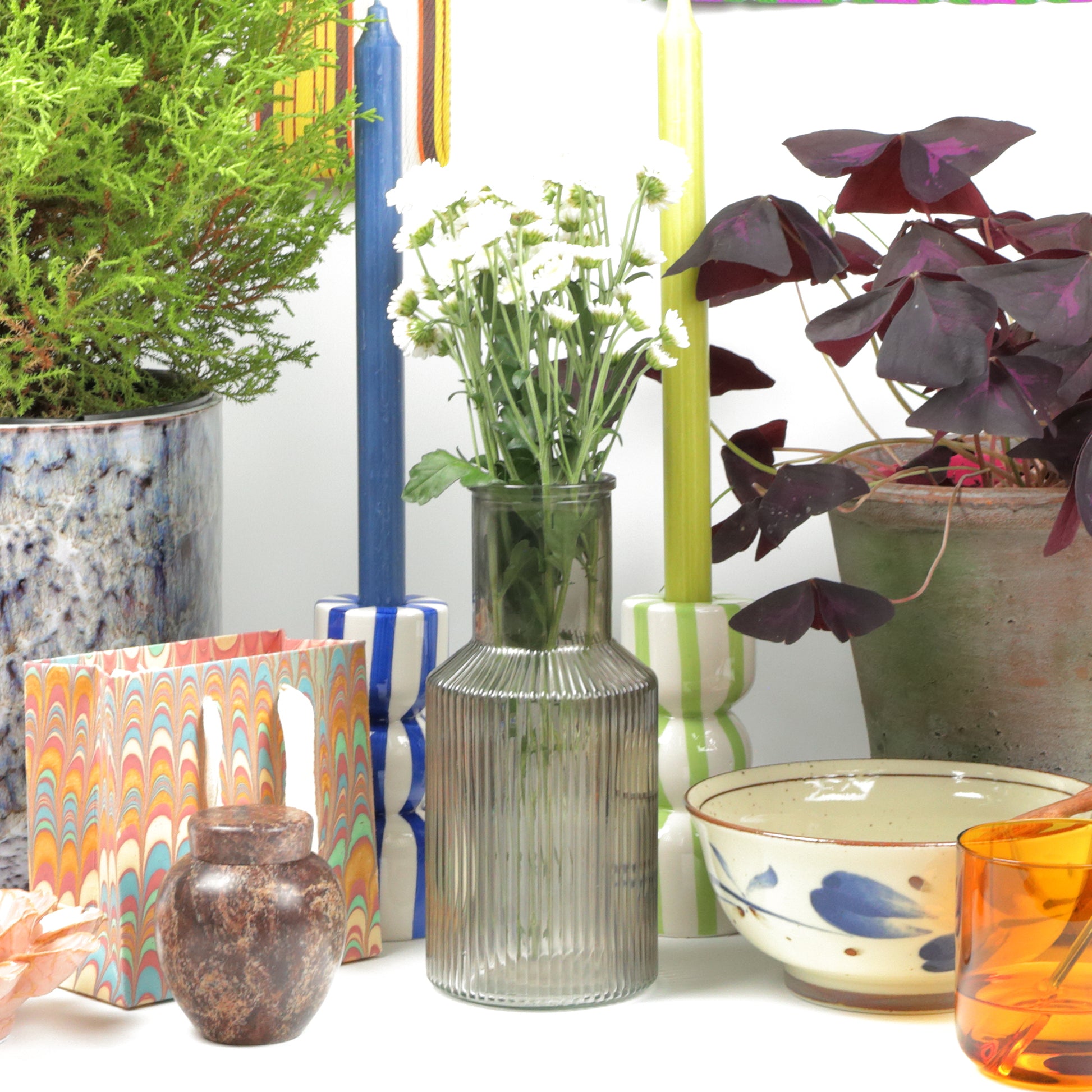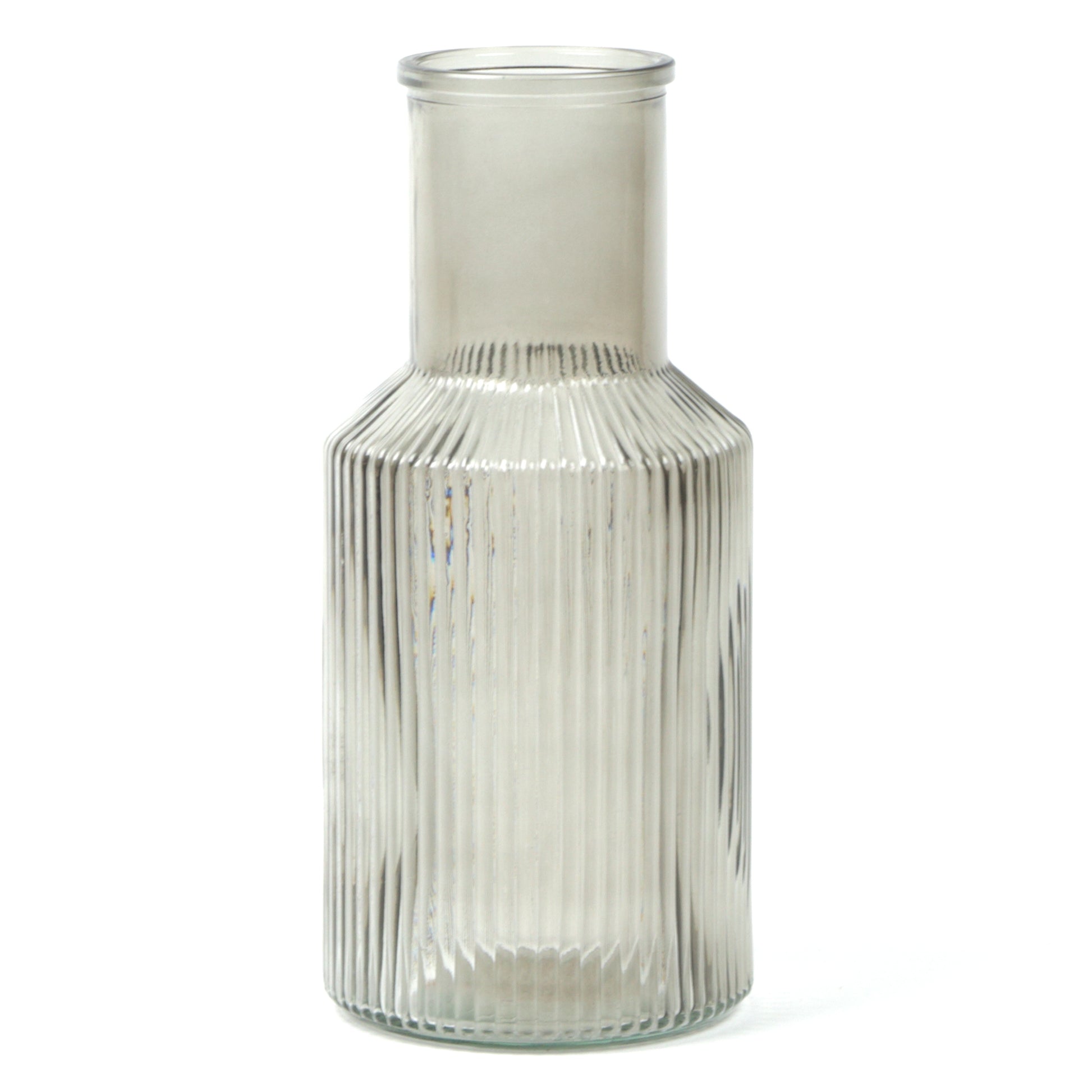 A striking glass vase with subtle ribbed detailing that catches the light beautifully. The smoky tones create an understated elegance, making it an ideal focal point for any interior. Perfect for displaying fresh or dried flowers, or as a standalone sculptural piece. Its timeless design complements both contemporary and classic décor, adding depth and character to shelves, mantels, or tables. Handmade, each piece is unique.