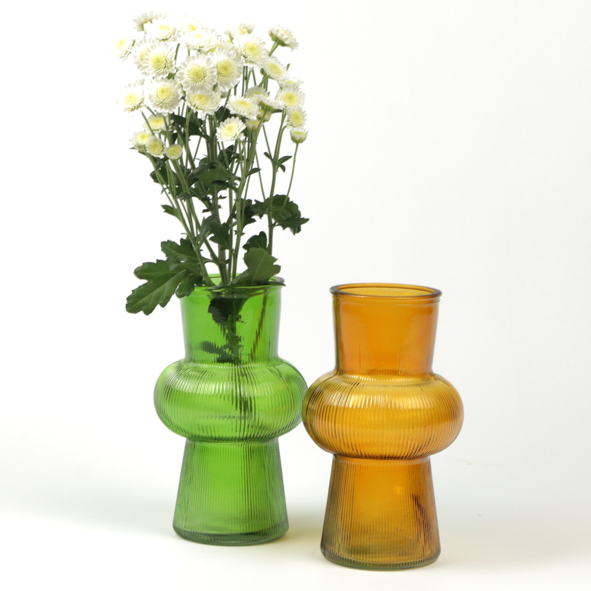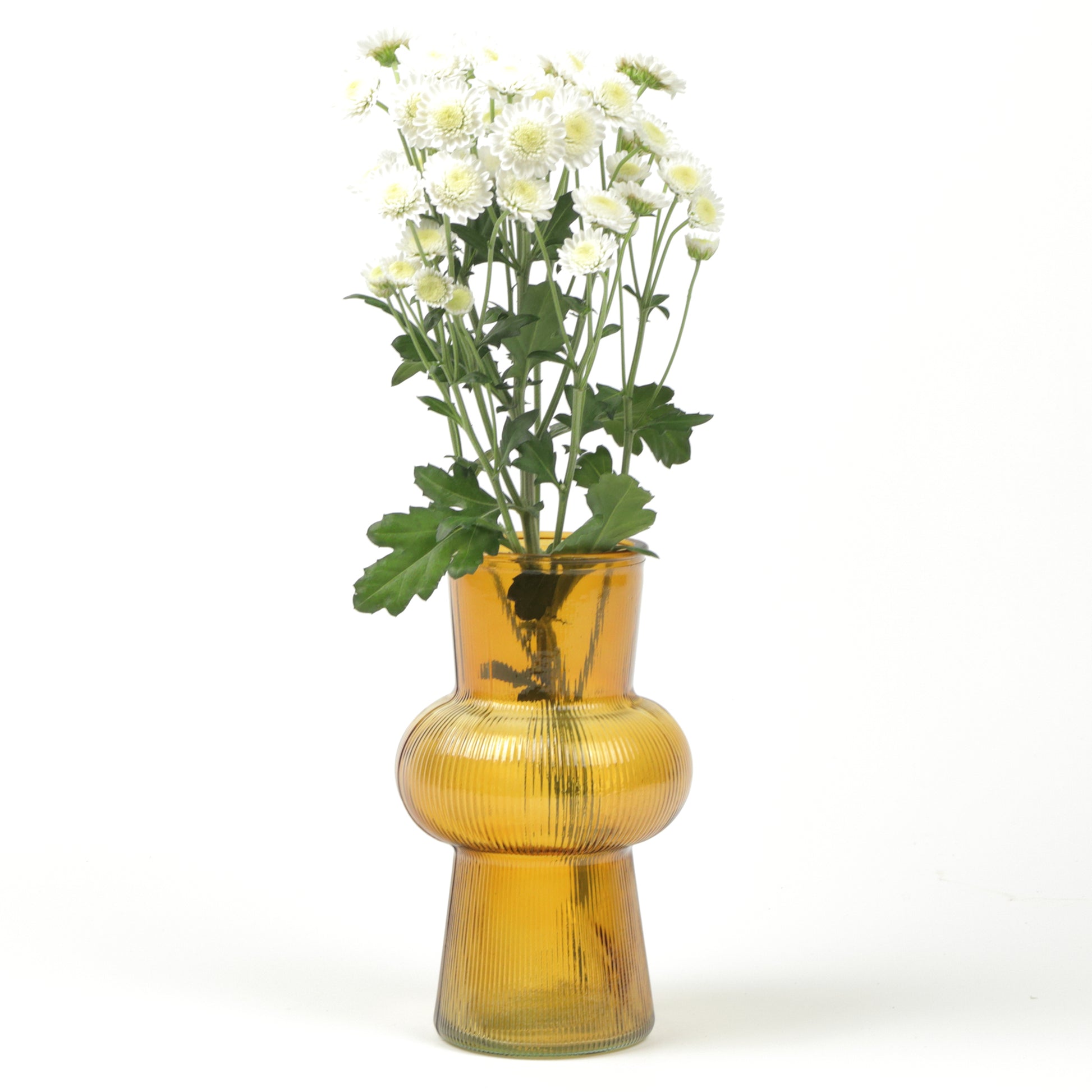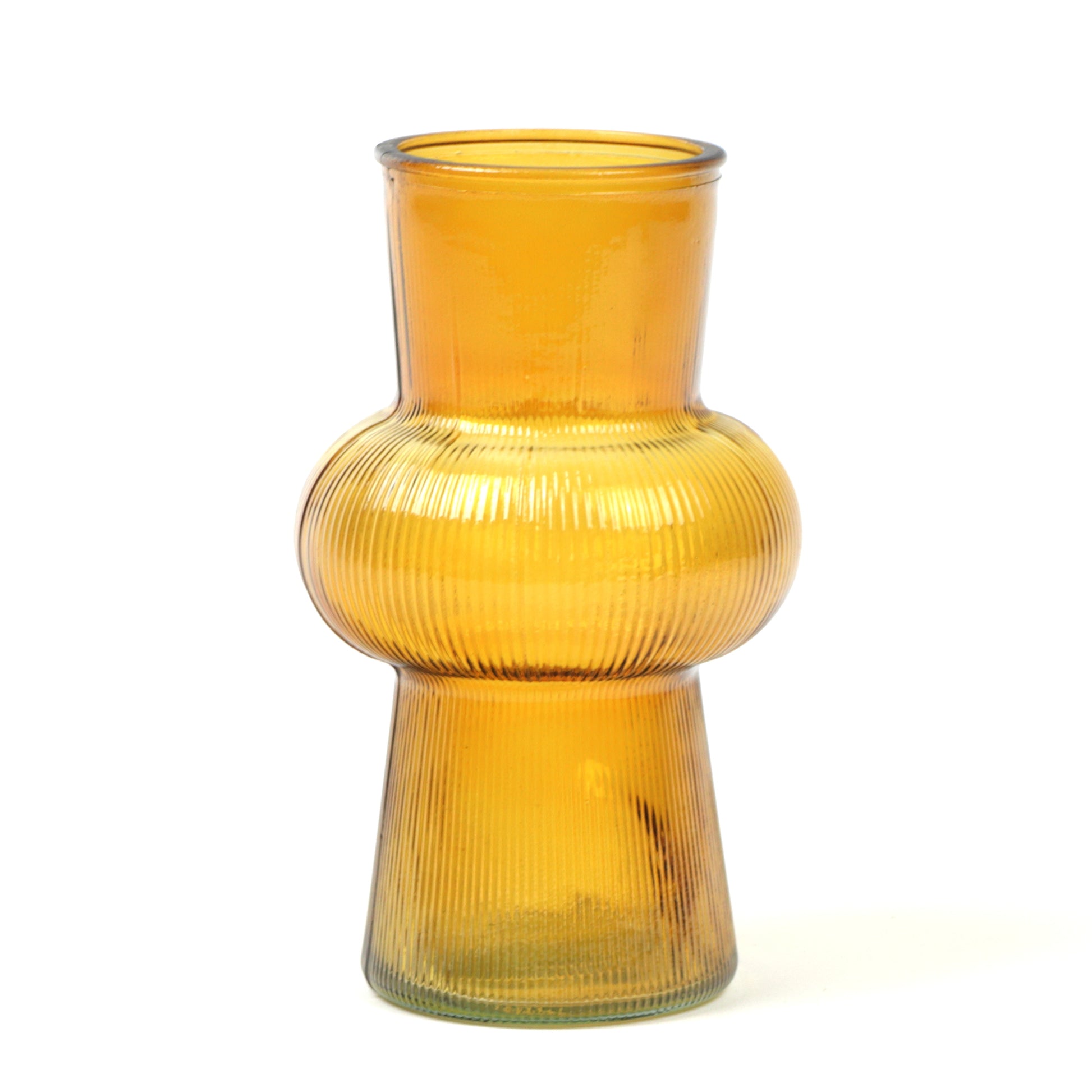 A contemporary vase with architectural presence, defined by its tapered cone silhouette and carefully crafted ribbed texture. The rich amber finish brings depth and sophistication to any space, whilst the linear detailing creates captivating interplay of light and shadow. Whether showcasing dried stems or standing alone as sculptural décor, this piece elevates modern interiors with understated refinement and timeless appeal. Handmade, each piece is unique.