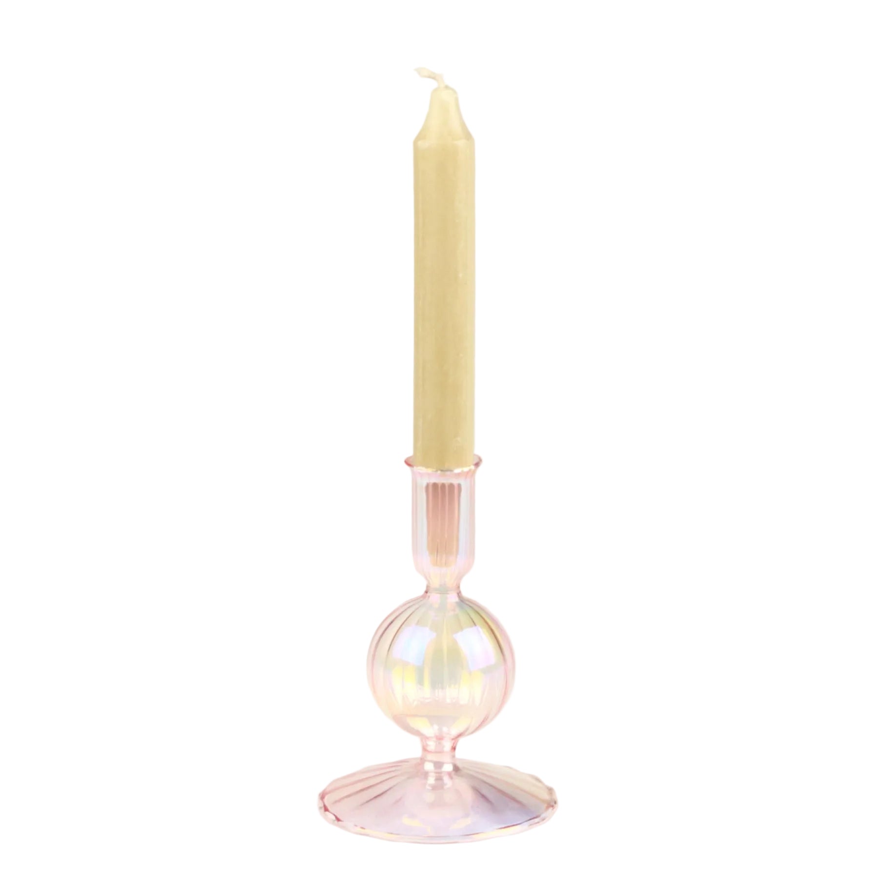 This glass candlestick features a luminous pink pearlescent finish that catches light beautifully, casting a warm, ambient glow. The spherical design offers a contemporary take on classic candlelight, making it equally striking as a standalone decorative piece or paired with others for layered table styling. Handmade, each piece is unique.