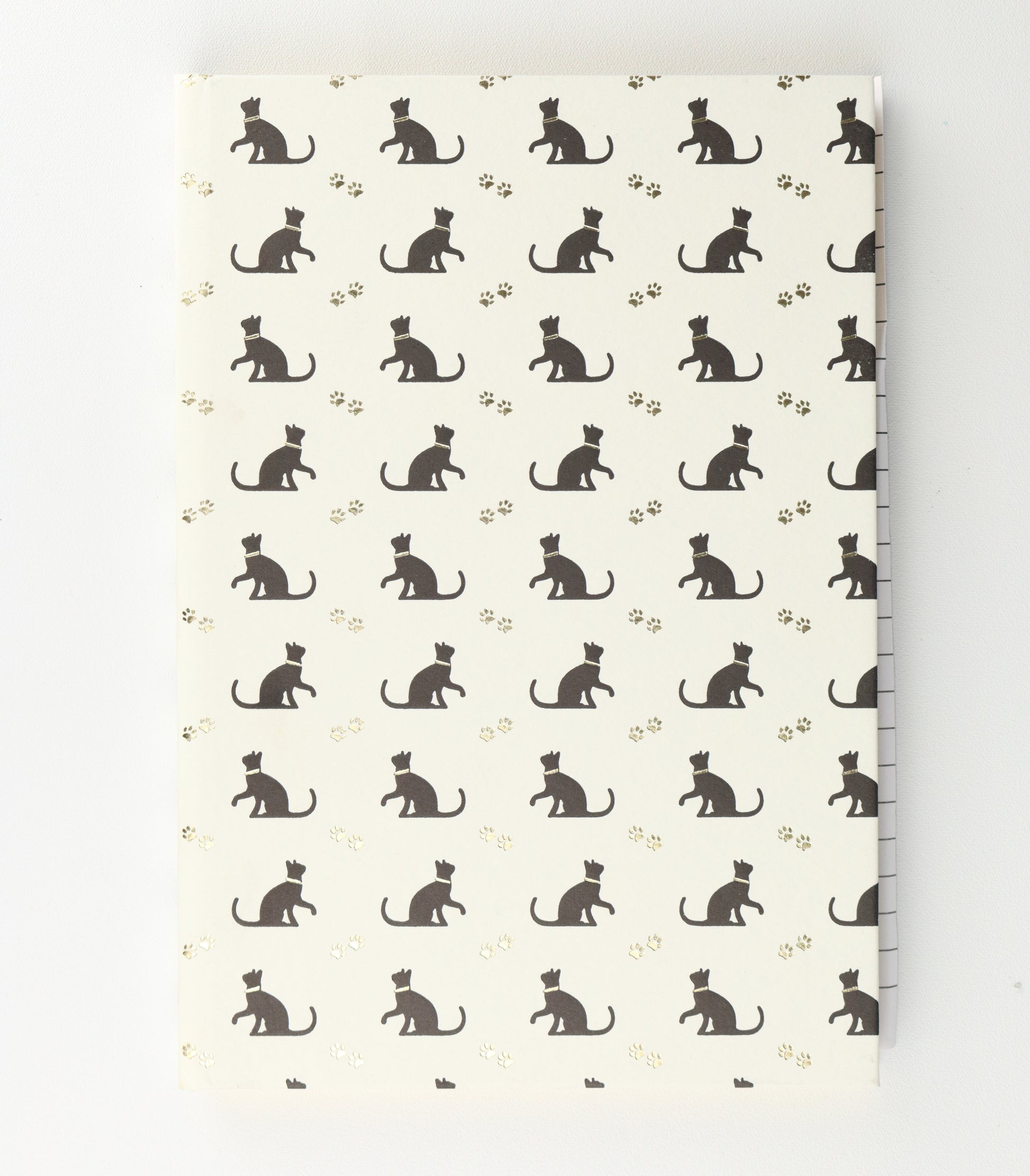 An charming hardback plain A5 notebook, with a geometric pattern formed of noir cats and pawprints and a dazzling gilded edge. As the notebook is plain, a lined guide sheet is included to keep your sentences unswerving. Handmade, each piece is unique.