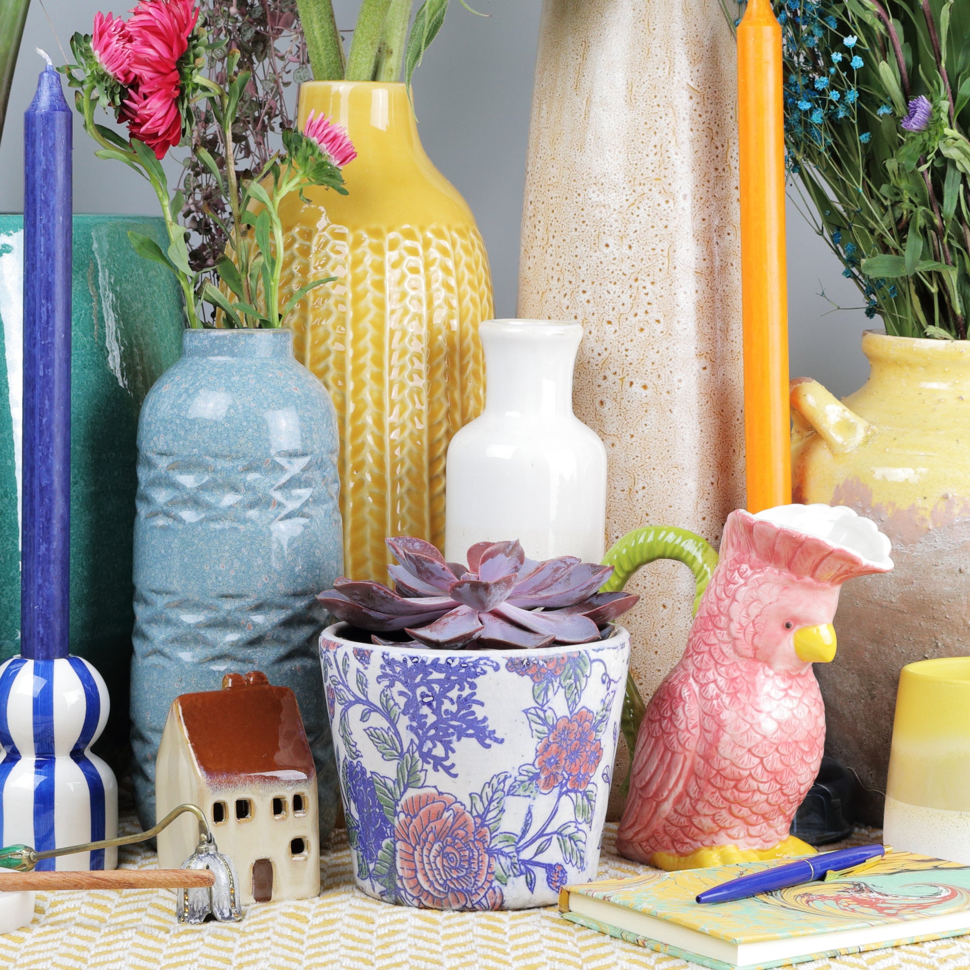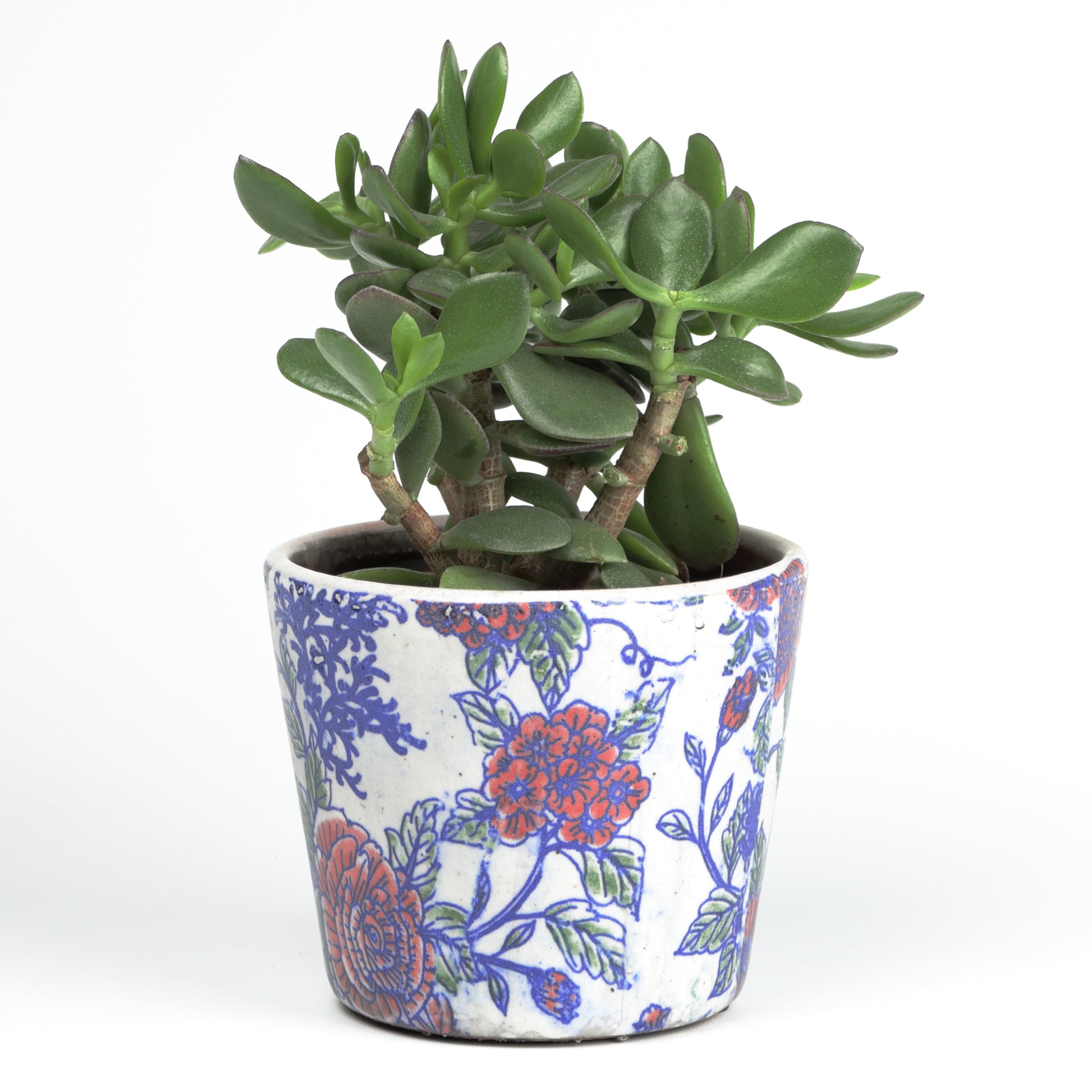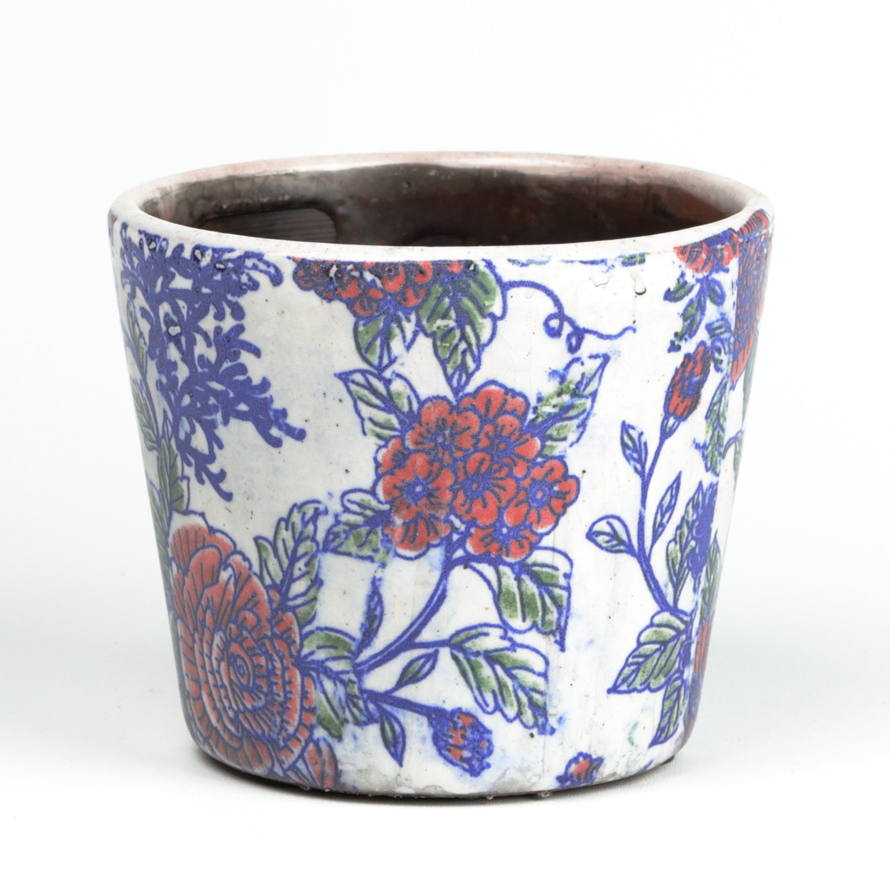 A simple pot that compliment any plant it houses with it's ivory body and floral design. This pot is crackle glazed giving it a quaint look that is loved by many due to it's ability to add a rustic look to your interior. Handmade, each piece is unique. Sealed, no drainage holes.