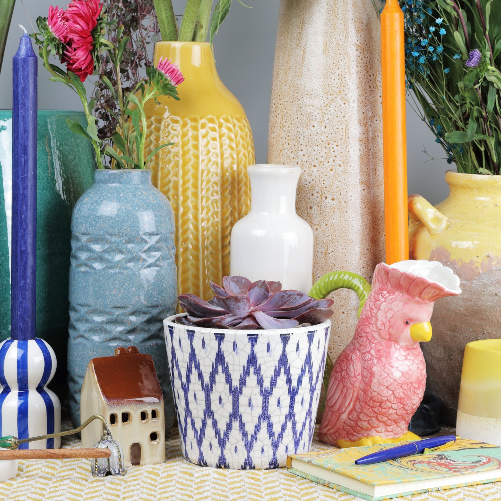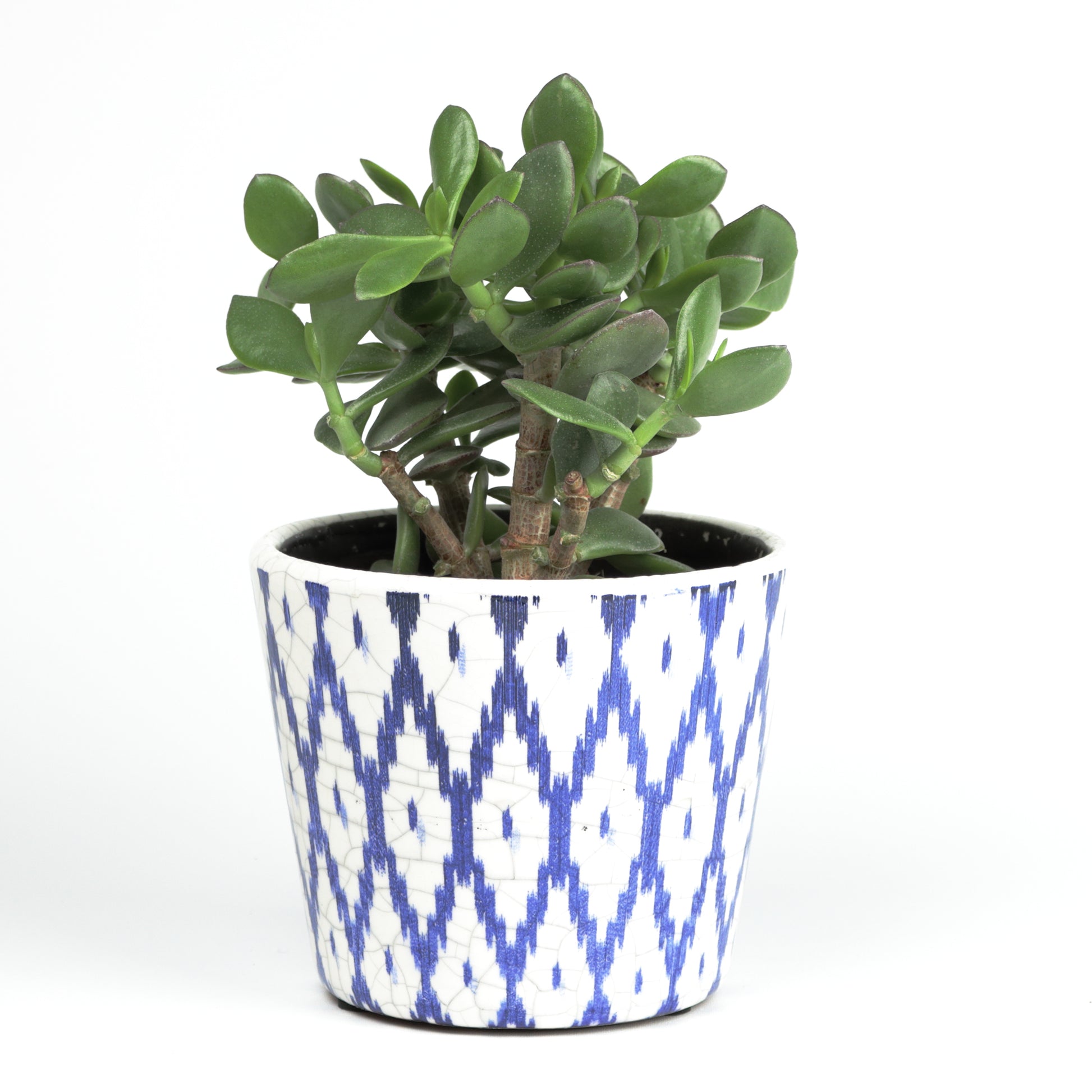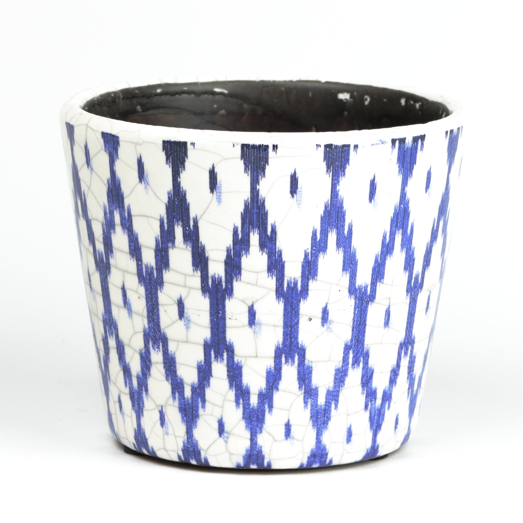 A simple pot that compliment any plant it houses with it's ivory body and diamond pattern. This pot is crackle glazed giving it a quaint look that is loved by many due to it's ability to add a rustic look to your interior. Handmade, each piece is unique. Sealed, no drainage holes.