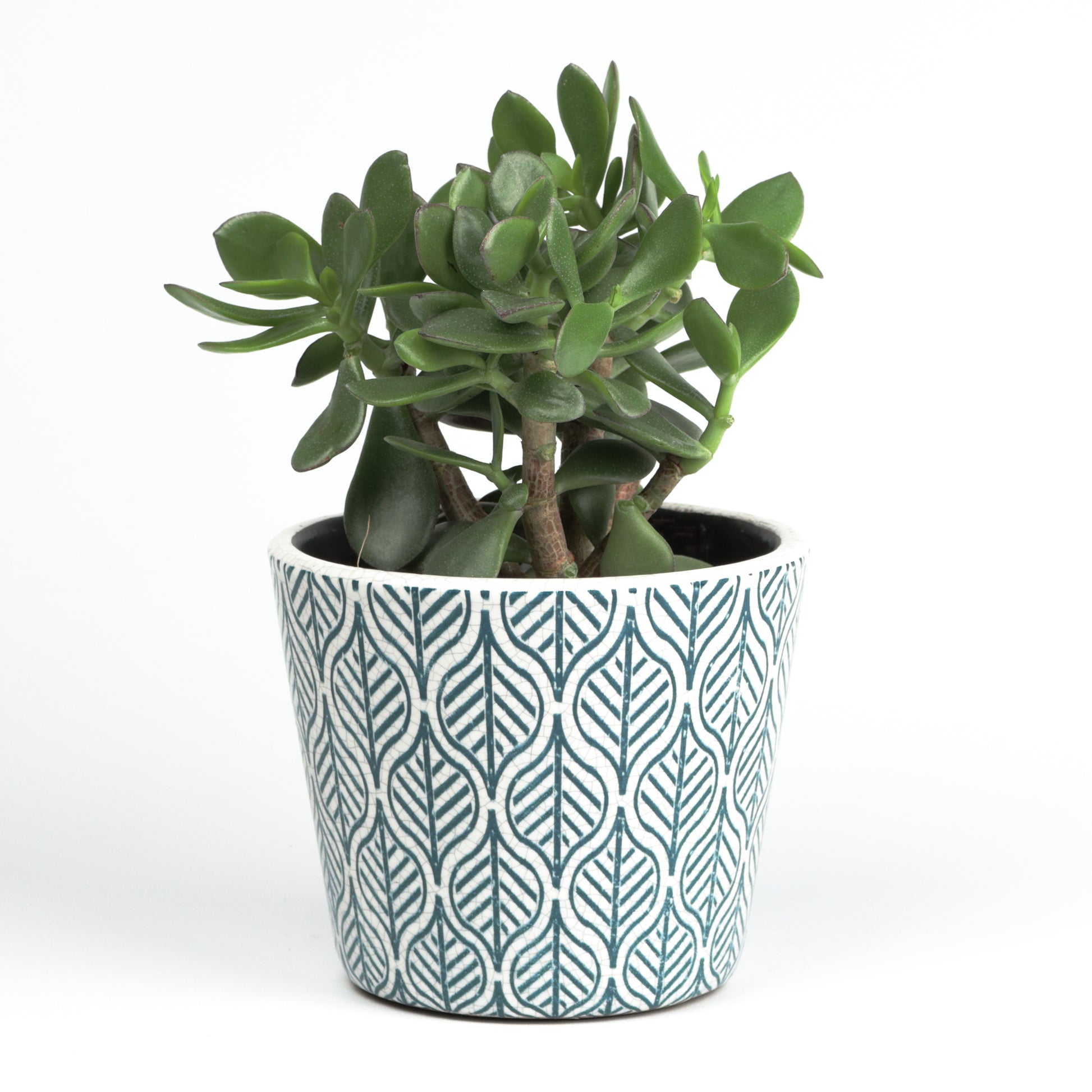 A simple pot that compliments any plant it houses with it's ivory body and teal structured leaf designs. This pot is crackle glazed giving it a quaint look that is loved by many due to it's ability to add a rustic look to your interior. Handmade, each piece is unique. Sealed, no drainage holes.